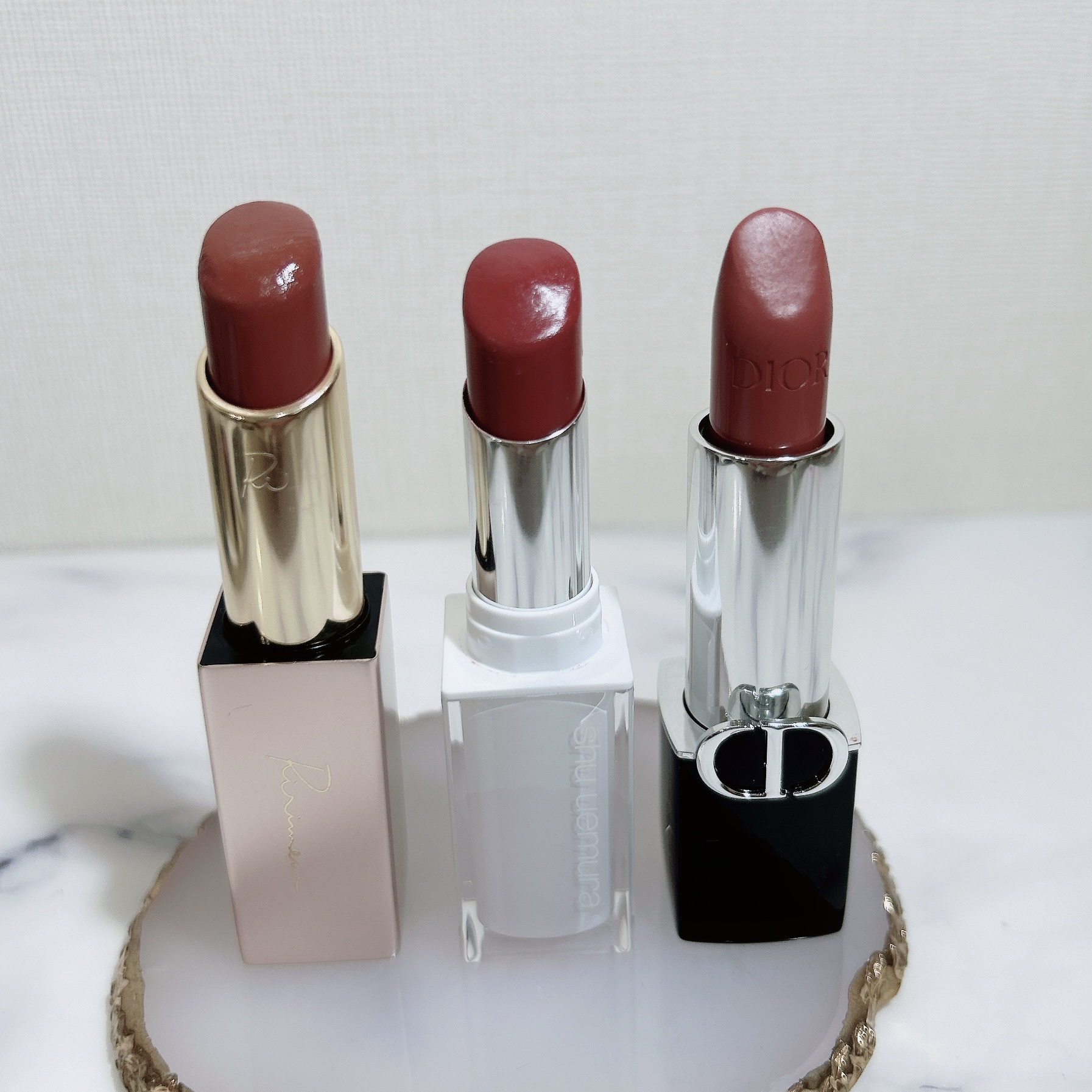 ソフトマットでポンポン塗りするとふわっとした唇になるとっても可愛いリップ。並べてみると赤みを感じる。色もしっかり持ちます 透け感ツヤ感がある!そして淡い。やわらかいピンクベージュ。落ち着いた品のある感じ、自然な血色ベージュを纏える リップクリーム感覚で使えるうるうるリップ。細身なので塗りやすい。秘めた炎よりピンク感が少し足されてるかな?とにかく塗り心地が良くて敏感な時でも使える。そしてすっぴんでも合う発色◎1000円以下というコスパはかなり強い。