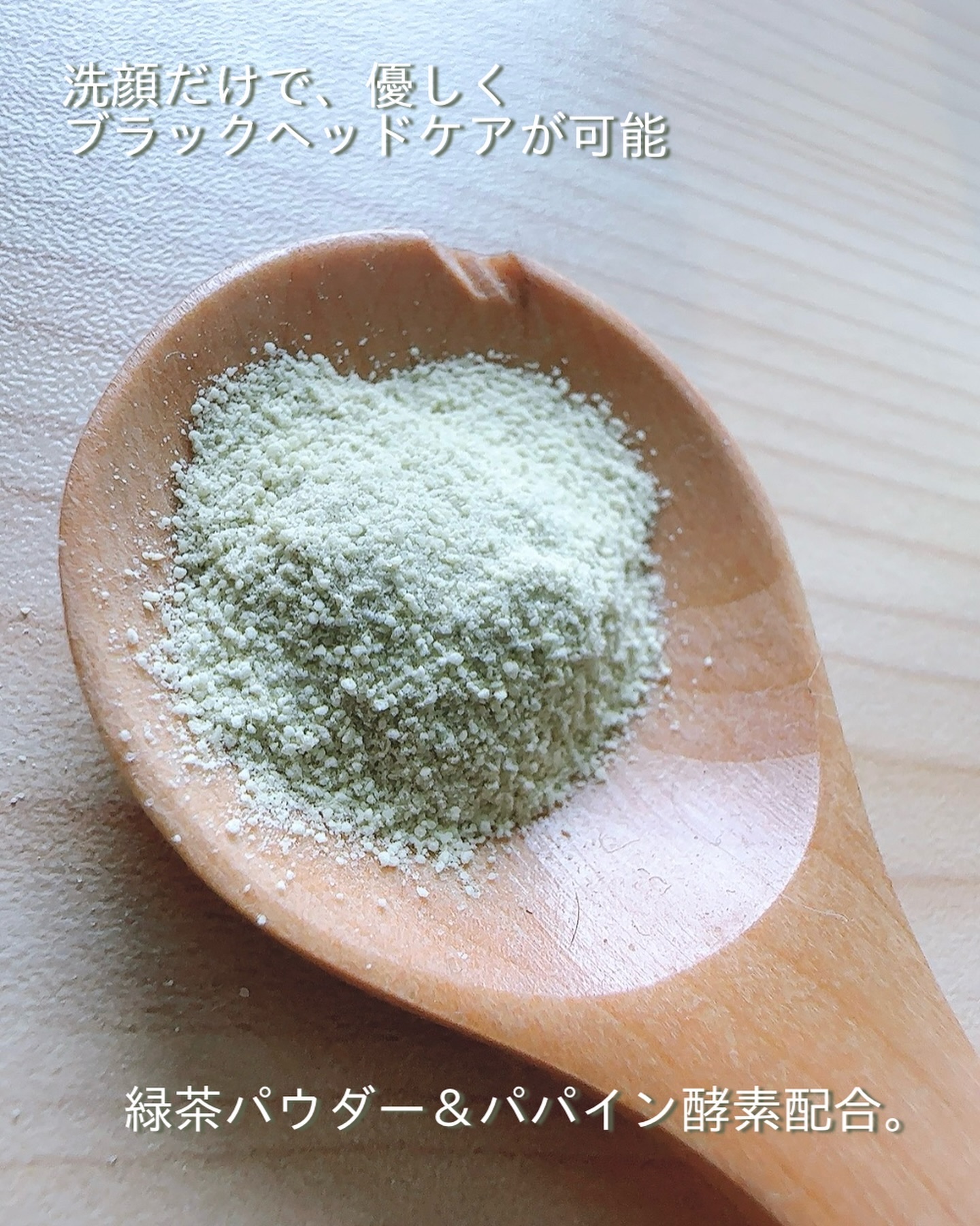 緑茶でいたわる肌 ♡緑茶パウダーとパパイン酵素配合(全て整肌成分) 敏感肌のための角質除去 ♡香ばしい緑茶の香り 洗顔から角質ケアまで量を変えて使えます◎ 泡立てネット使えばよりもっちりとしたもこもこ泡で洗うことができます𓂅
