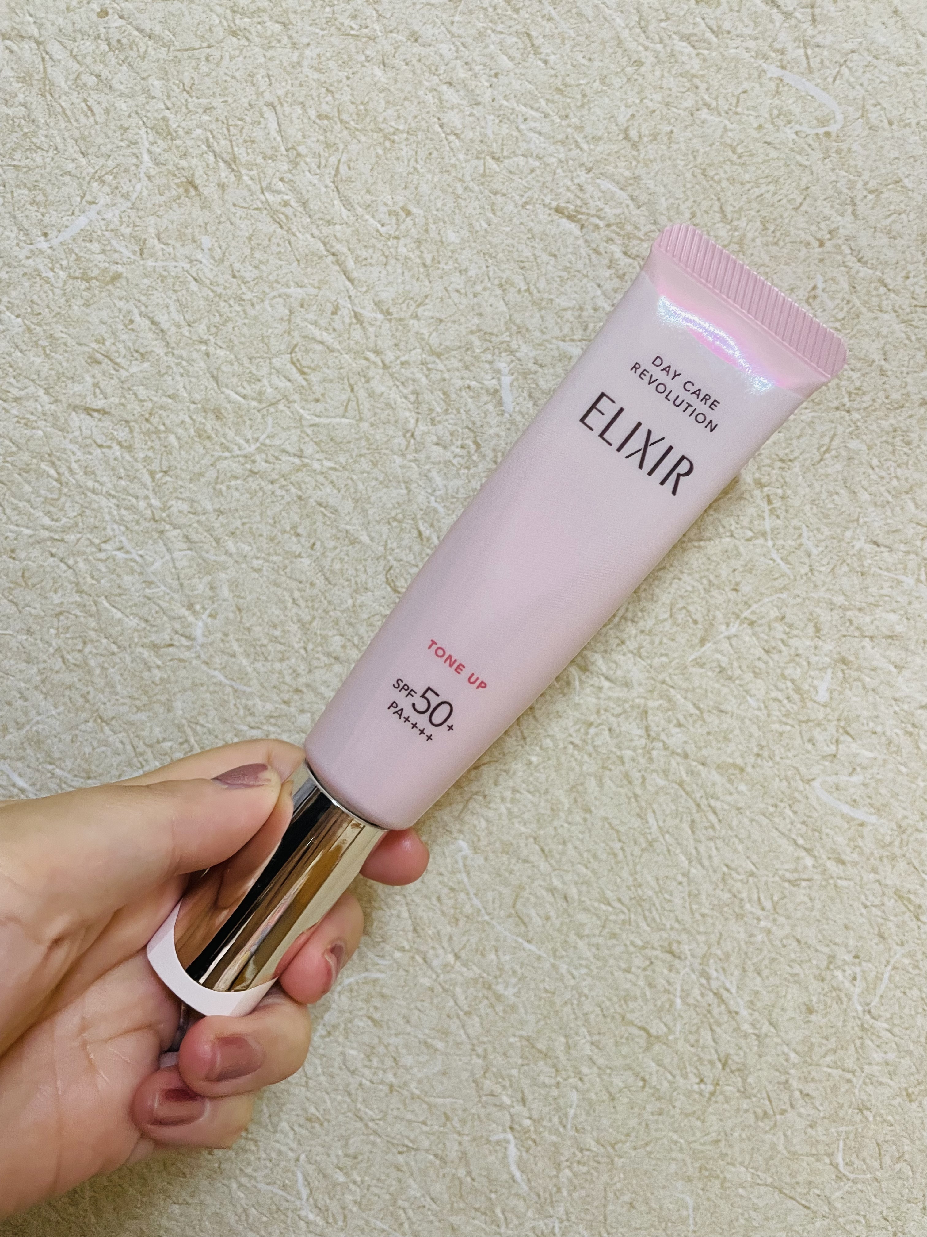 大バズりしていて売り切れ続出だった エリクシールのデーケアレボリューション♩ 乳液、UVカット、化粧下地の役割があって化粧水塗ったあとはこれ1本で済ませられるから時短にもなって嬉しい◎ 塗ってみるとちゃんと馴染んで自然な血色感を出しつつ、パーンっと明るい肌になってくれる🫶✨
