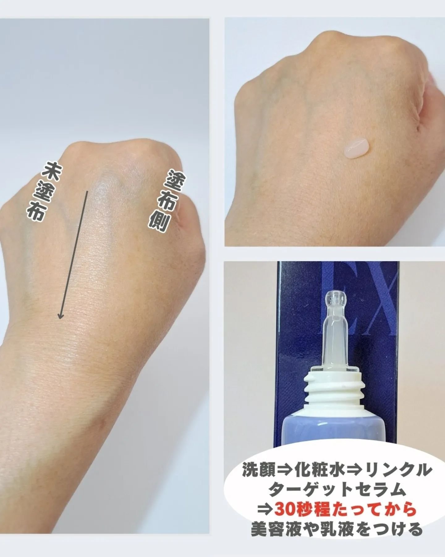 シワ改善・美白を同時に叶える美容液。 有効成分「ナイアシンアミド」、抗炎症をサポートする「グリチルリチン酸ジカリウム」のW有効成分を配合、 テクスチャーは白っぽいジェルみたいな感じで、しっとりします。伸びがとてもよく、肌に密着しているのを実感しました。