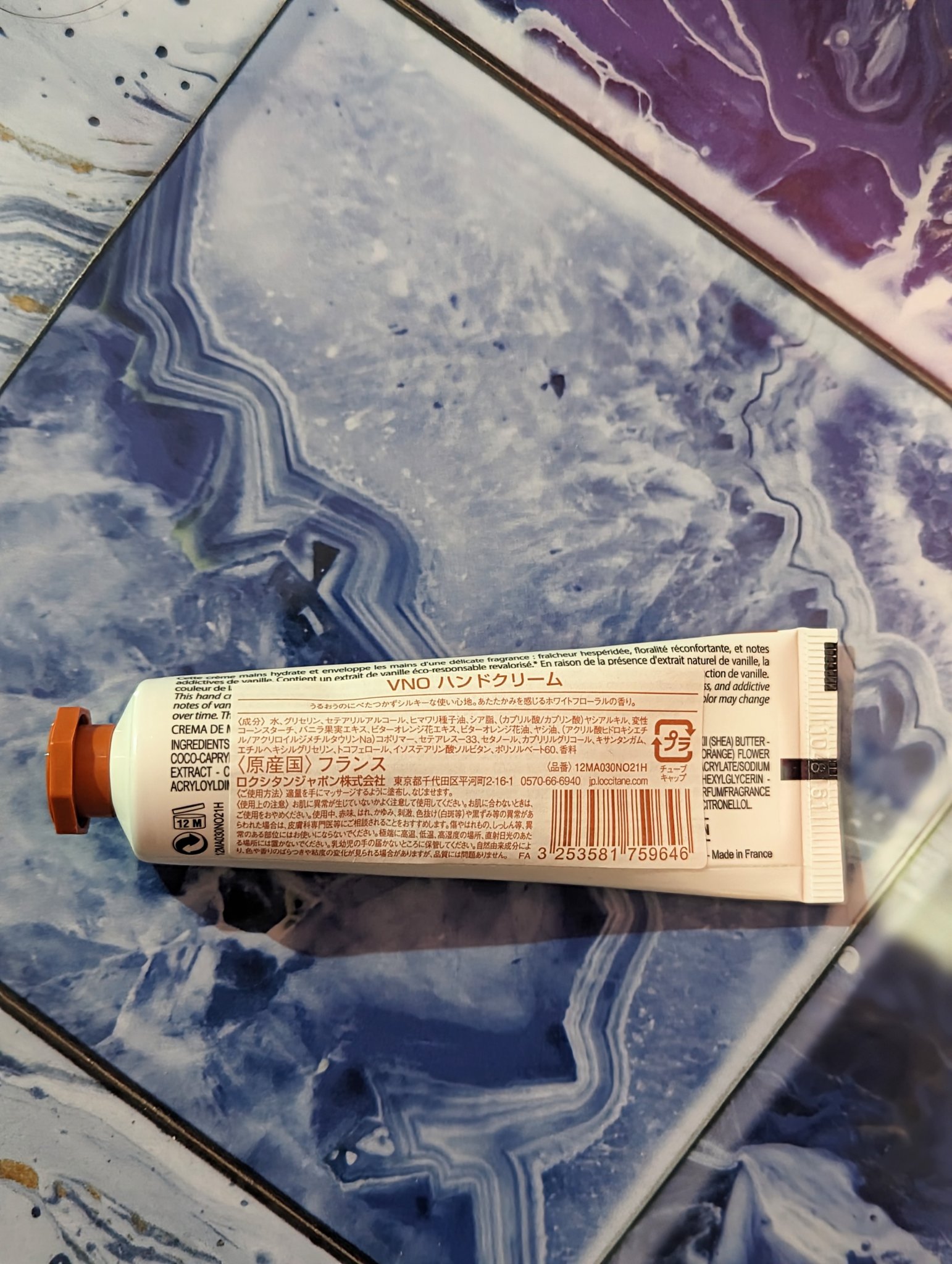 フローラル系の甘い香りで、百貨店などの化粧品売り場に似た匂いです 蓋を開けた瞬間に、ふわっと甘い香りが広がるのもとても推しポイントです これ1つで2つの役割を果たしてくれるハンドクリームです