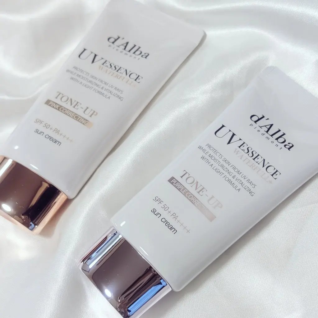 お肌により優しい成分で透明感のある透明美肌を叶える! d'Alba ウォータフルトーンアップサンクリーム UVケアだけでなく、色ムラ補正やトーンアップも期待できる嬉しい日焼け止め☀ どちらも、SPF50+、PA++++ 黄くすみが気になる人、透明感を出したい人にオススメ! そして、アジア系肌の人はとても使いやすいかも〜!