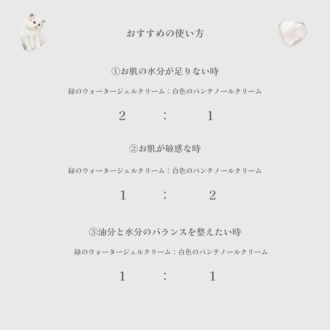 季節、天気、ホルモンなどによって日々変化するお肌の調子に合わせて自分の好きなように使えるデュアルクリーム。 2種類のクリームがお肌の潤い・栄養・活力まで!もっちりハリのある素肌を叶える! 肌の水分が足りない日はウォータージェルクリーム、肌が敏感になっている日はパンテノールクリームの量を増やして使用すると良いらしく、使い分けできるのが嬉しいです。