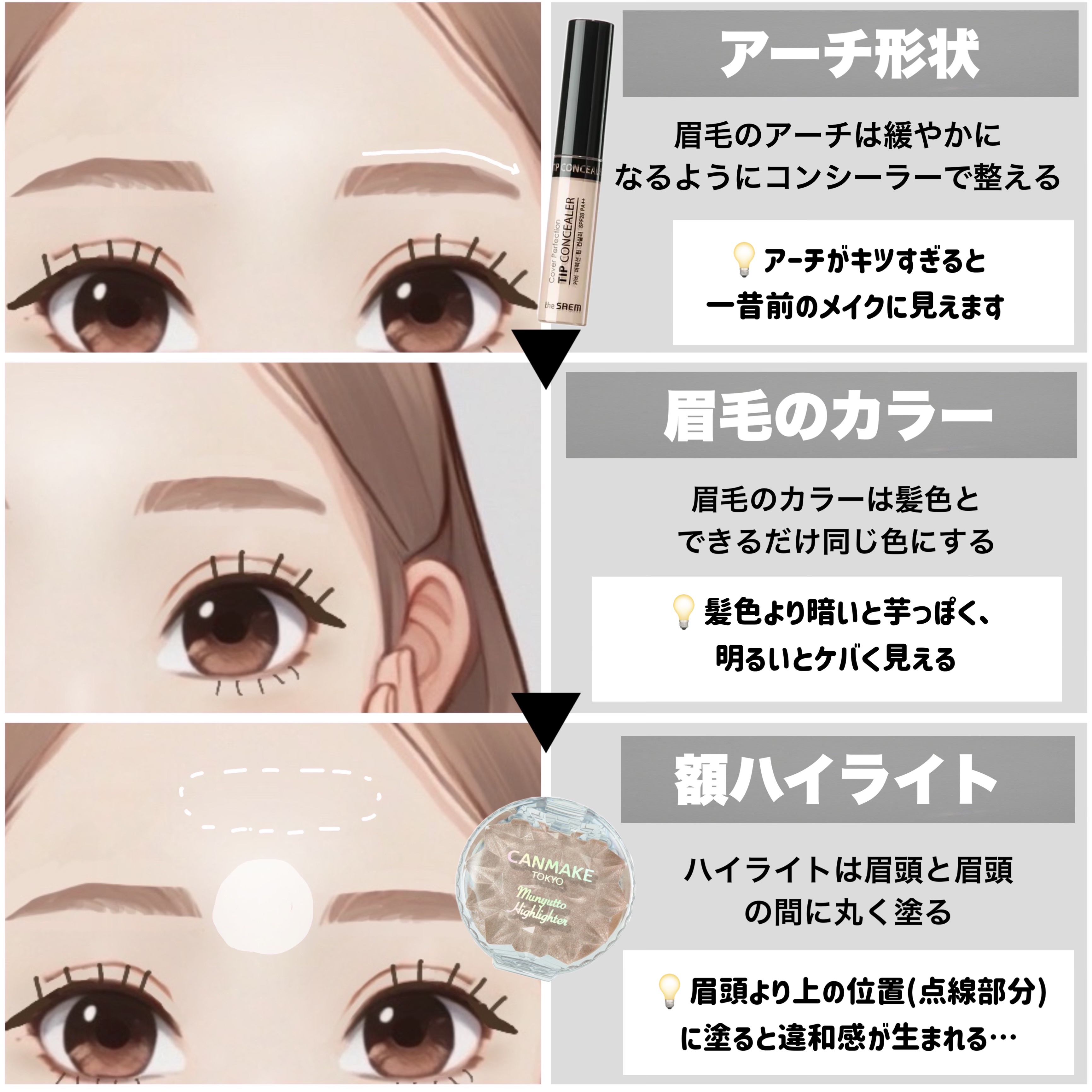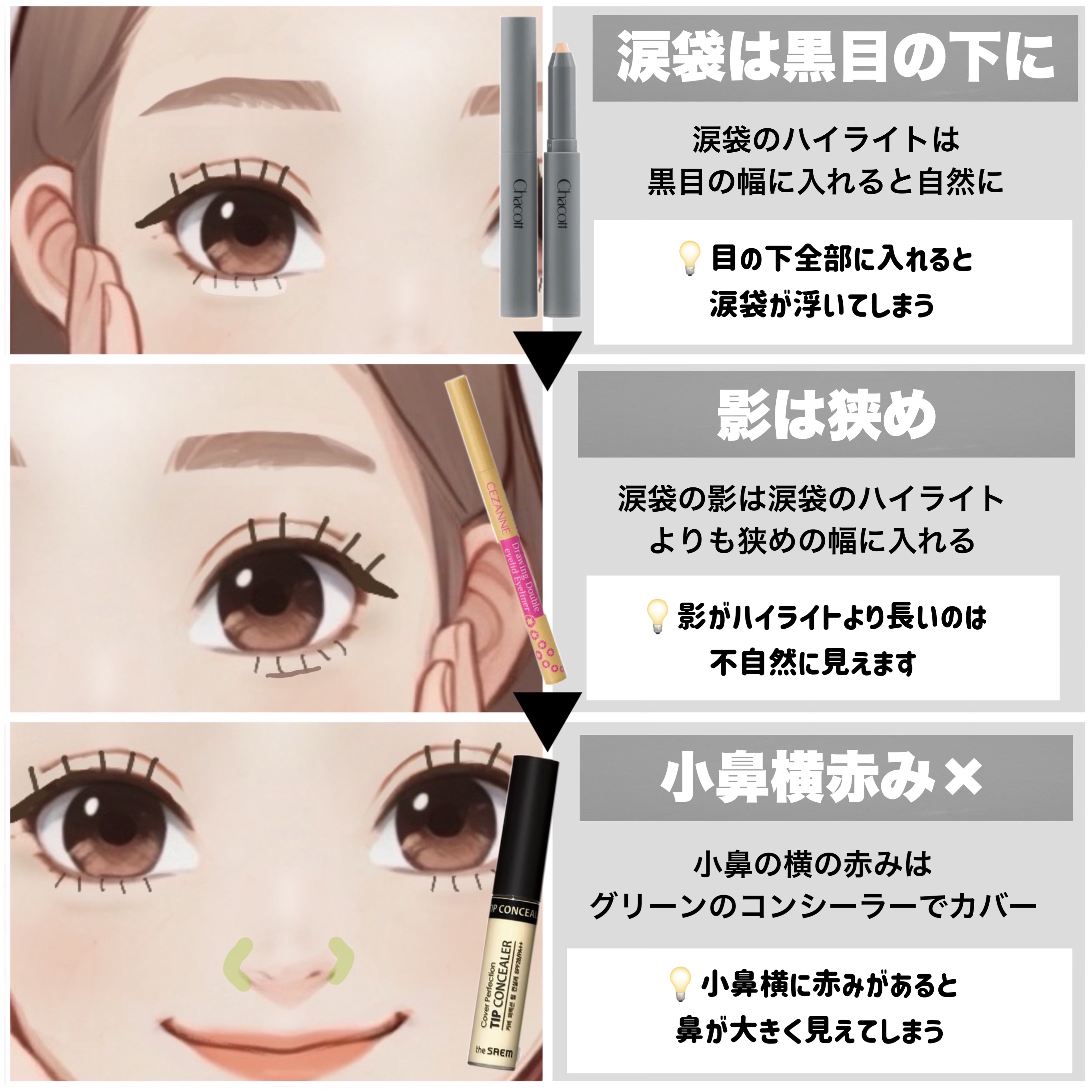 特に、平面顔さんが盛れるメイクです!! ハイライトの効果で顔のくぼみを底上げして、元々出っ張っている部分をより立体的にすることで 骨格を整えることができるそうです! ♡ 使うコスメ(どちらか一つ) ✔️ マットなホワイトハイライト ✔️ 肌色より明るいコンシーラー