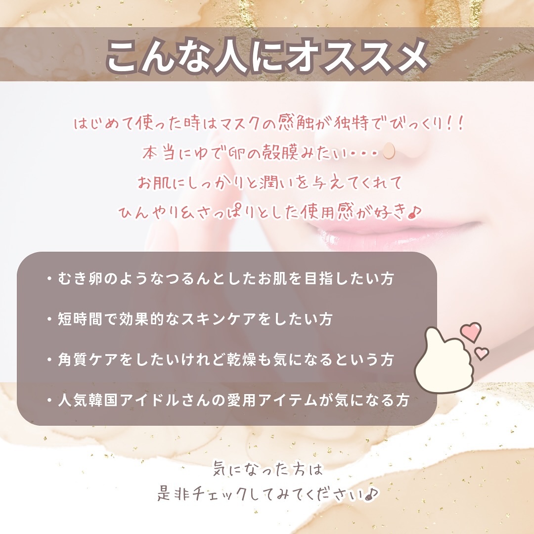 コラーゲン、ヒアルロン酸でできた卵殻膜▶肌から有効成分が抜けないように保護。肌の弾力維持。 ゆでたまごみたいにツルツル肌へ。 卵の殻の薄膜のような超繊細、繊維シートが肌にピタッと密着。 13分放置。