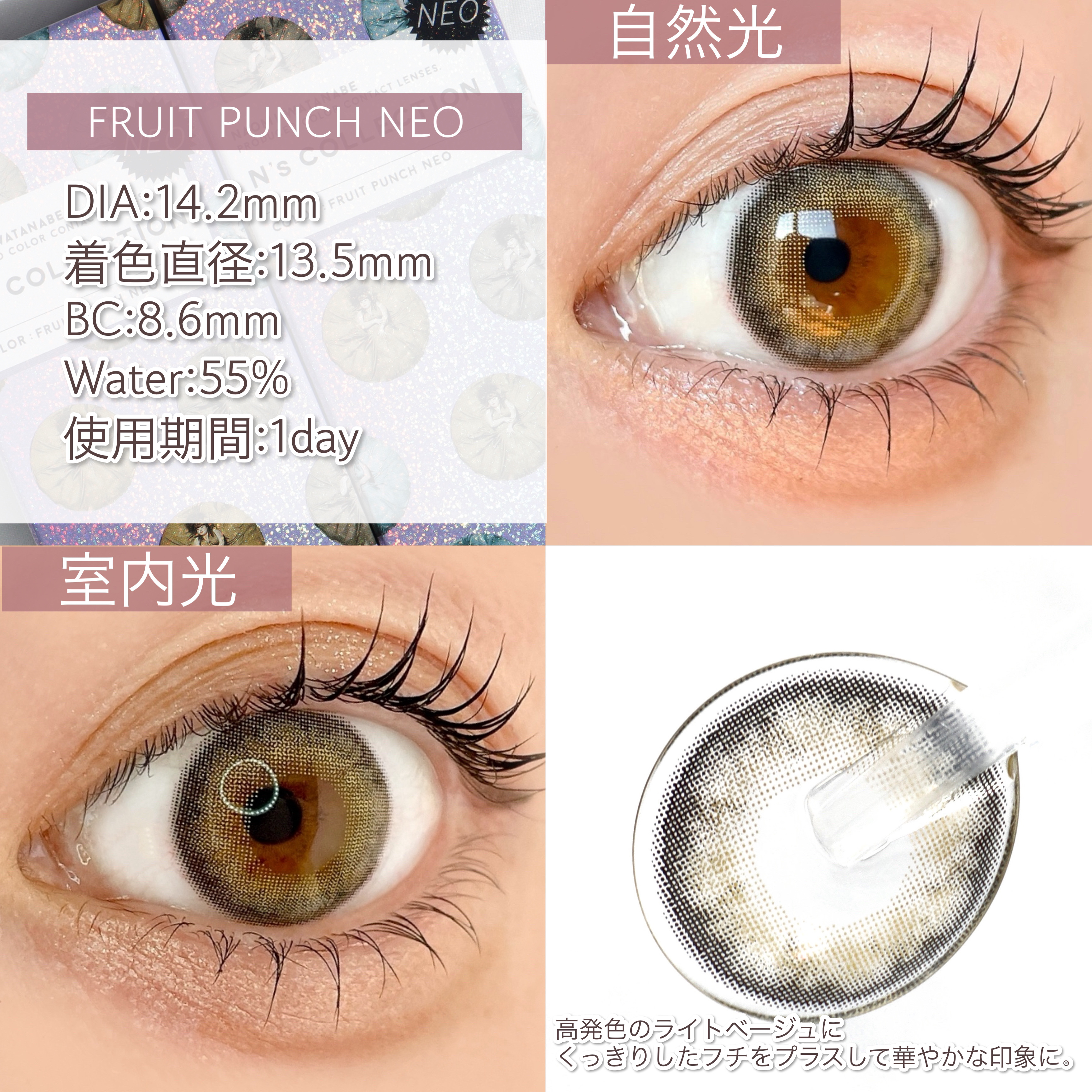 - ※2025年6月以降、商品パッケージ裏面・側面の一部表記を順次変更いたします。尚、これにかかる商品の交換・返品は承っておりません。 「大きく見せる」「盛る」といった従来の視点だけではなく、メイクと合わせることでより魅力的な印象をつくる“メイクを引き立たせるカラコン”をコンセプトにレンズを開発。 プロデューサーである渡辺直美さんが発信するトレンドのしっかりメイクに合うレンズデザインから、日常的なナチュラルメイクに合うデザインまで、さまざまなメイクを引き立てる11種類のレンズを展開します。 カラーコンタクトレンズの不適正使用による眼障害の危険性等などがあります。 ●コンタクトレンズは高度管理医療機器です。不十分な洗浄・消毒など不適切なケアや、長時間・交換期間を超えた装用により、アレルギー性結膜炎、角膜感染症、角膜潰瘍等の重篤な眼障害が発生する危険性があります ●ご使用前に取扱説明書を確認してください 使用上の留意事項 ●眼科医院等を受診してからお求めください ●眼に異常を感じたら直ちにレンズ使用を中止し、お近くの眼科等で診察を受けてください ●医師の指示にしたがってご使用ください ●コンタクトレンズを装用する場合、自覚症状がなくても、眼科医院等での定期検査を受けてください ●レンズに不具合がある場合は使用しないでください