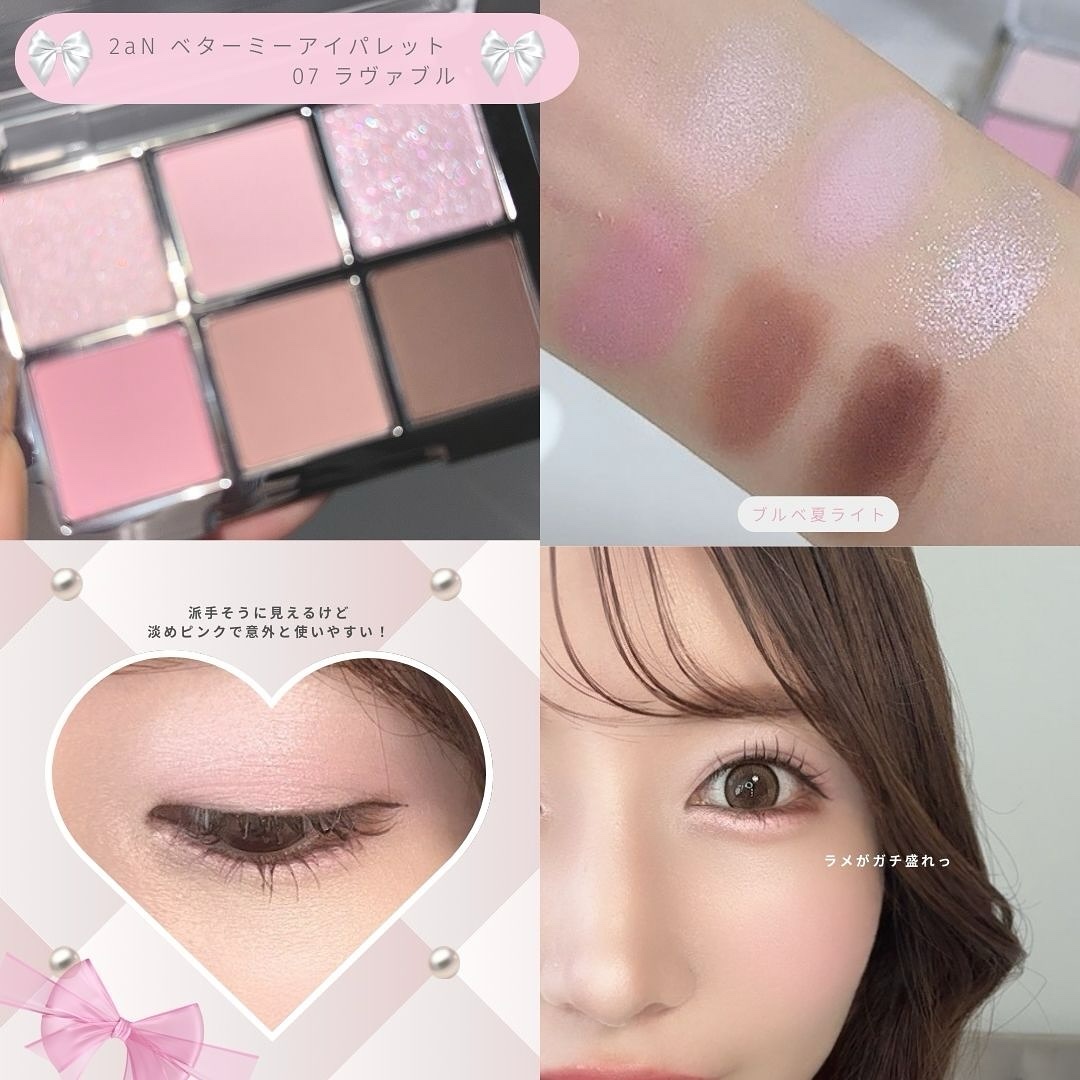 今話題の2aNベターミーアイパレットから新色2色が登場!カラーはどちらもピンク系です✨ 発色は柔らかく、ふんわりとした印象の目元に。しっかり色づき、見たままの発色です。特にラメが可愛くて、雪の結晶のような繊細な輝きです! どちらも捨て色なし、使う色だけ厳選されている感じがお気に入りです!