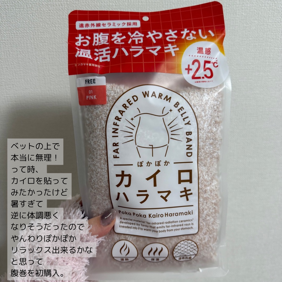 ぽかぽかカイロハラマキ!意外と長さがあり胸下からお尻の上半分くらいまで包み込んでくれます。 触り心地ももこもこふわふわもちもち♡ 締め付け感もなくて気持ちいい〜☺️ 寒い冬にはもちろん、生理でお腹が痛い時にもおすすめ❤️ 同じシリーズのカイロソックスも気になる〜!!