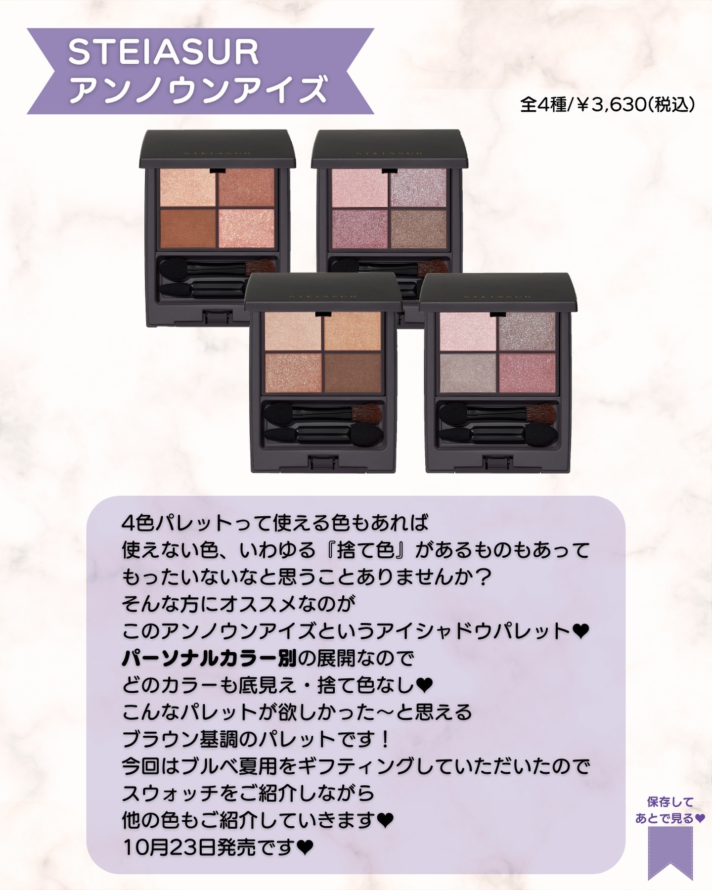 - パーソナルカラーで選べる、全色底見えブラウンアイシャドウ「#知らなかったブラウン」 パーソナルカラーコスメブランド「STEIASUR(ステイアシュール)」から、全色底見え・捨て色なし設計のアイシャドウ「アンノウンアイズ」が誕生。 「#知らなかったブラウン」シリーズは、パーソナルカラー別4色展開のブラウンアイシャドウです。 カラー&コスメコンサルタントの渡辺樹里さん監修で、ラメやパールの配合など、プロが細部にまでこだわって開発。 一度使うと、「こんなに自分に似合うブラウンアイシャドウは今まで知らなかった」と感じるはずです! マーブルのパッケージが可愛いらしいので、大切な方へのプレゼントにも最適。 <POINT> ⚫︎パーソナルカラーのプロが監修(カラー&コスメコンサルタント渡辺樹里さん監修) ⚫︎高密着・高発色 ⚫︎パーソナルカラーに合わせて選べる4カラー ⚫︎全色底見え!捨て色なし設計 ●ダブルエンドのブラシ&チップ2種付き