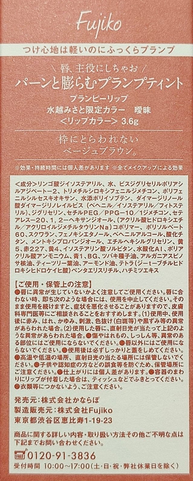 - フジコの新リップは、重ねるほどにパーンと膨んでみえるプランプティント*1。 ぷっくりと存在感のあるリップメイクで唇を主役に。 <プランプ成分(清涼成分)> "メントキシプロパンジオール”採用。 血色感、ボリューム感、クーリング感を演出します。 <オイルウォーターティント処方> 軽やかなオイルが唇に均一に伸び広がり、 FIXING。 時間が経ってもボリューム感と光沢感を演出。 しかもティントだから“落ちにくい”(*2)。 <5種の美容保湿成分配合> アルガンオイル・ツバキ種子油・アーモンド油 ティーツリー葉油・ハチミツエキス *1全てメイクアップ効果 *2効果・効能には個人差があります。