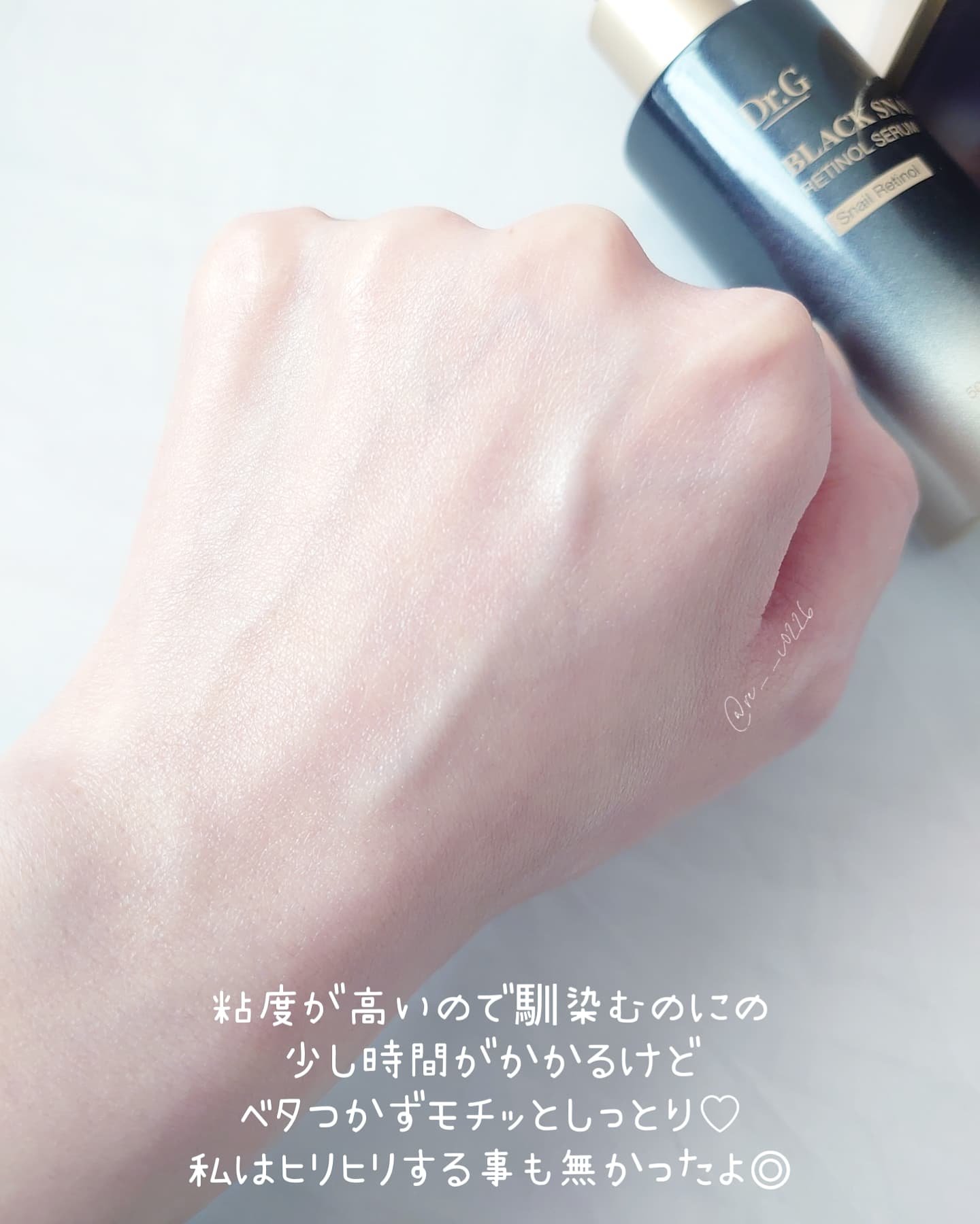 - ブラックスネイル*とレチノール*を配合した、若々しい肌印象に導く美容液です。 Dr.Gのレチノールは独自の成分である、ブラックスネイルレチノール*を使っています! 肌に高い保湿感を与え、肌のキメを整え、弾力やハリのケアを助けるだけでなく、肌の乾燥くすみをケアし、明るい印象のぷるんっとハリのある肌に導きます。 *整肌成分