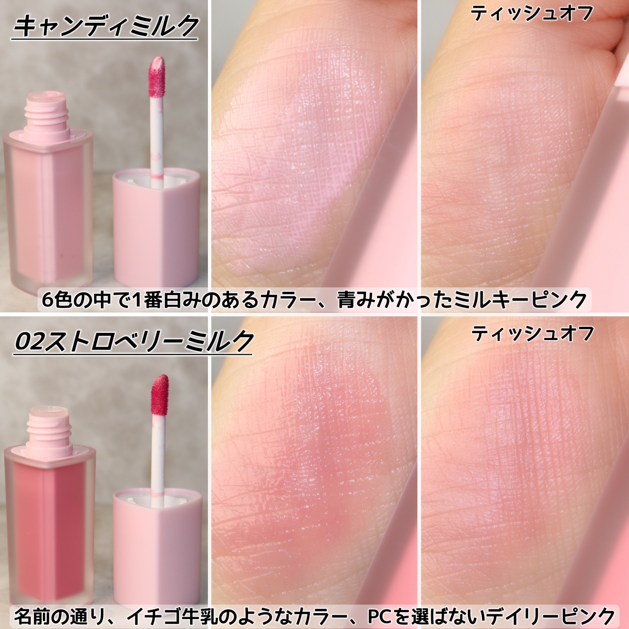 - 牛乳を混ぜたような特有の真っ白なカラーが特徴のグロッシーティント 韓国では2023年11月に総ダウンロード数1,600万の韓国発No.1女性ファッションECアプリを運営するABLYにてリップ部門ランキング1位を獲得、日本公式ローンチ前ビューティートップクリエイターemiseyoが自発的で進行したtiktokショートコンテンツが500万ヒット数に迫って突風を起こしました。その勢いを続け、12月に日本のQoo10に立ち上げ当日、リップメイク製品1位を上回り、短時間で累積レビュー700件を達成いたしました。植物性天然オイルビーガン成分のしっとりとした水光のティントで何度も重ねるほど、真っ白な光沢が際立ちます。 2024年4月より全国のバラエティショップに販売スタート