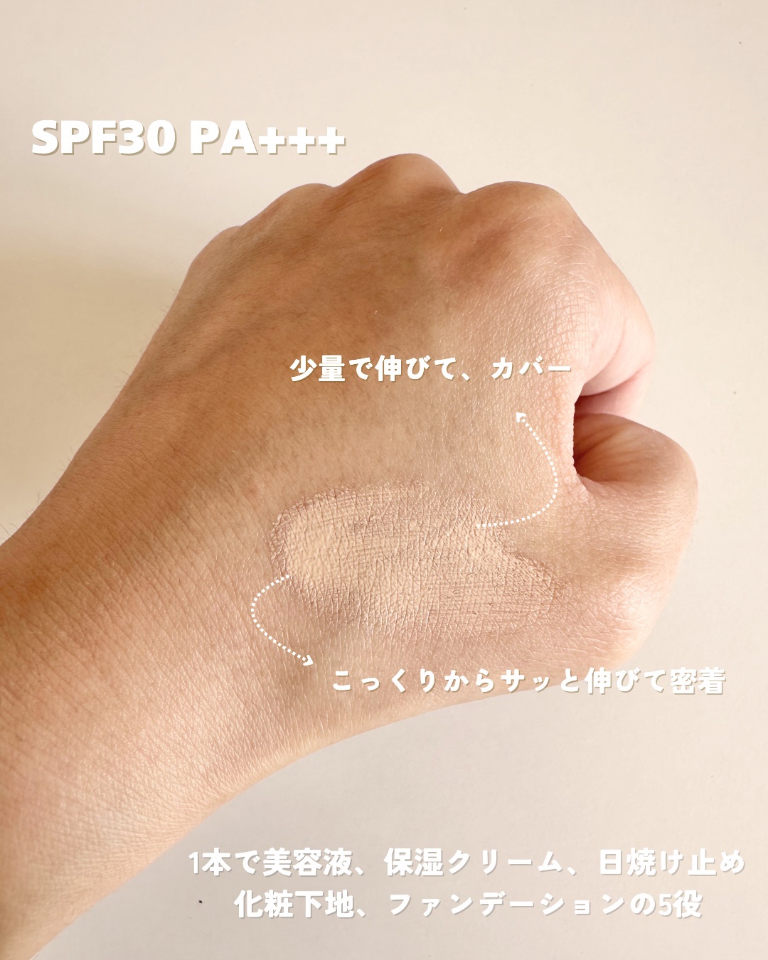 素肌に化ける*ファンデーション。 ジェルが作る塗膜により、化粧崩れを抑えてくれて つけたてのツヤが長時間続く! カバー力はしっかりありますが 厚塗り感がなく、自然なツヤも出てくれて まさに「素肌に化ける」仕上がりでした! 一番気に入っているのは崩れにくさ。 マスクをして一日仕事をしていても 毛穴落ちもなく過ごせて感動し、 検証がてら連日使ってみましたが見事に崩れない…◎ 塗り心地も軽く、理想のファンデーションだと思います! スパチュラも付いてるので衛生面でも◎