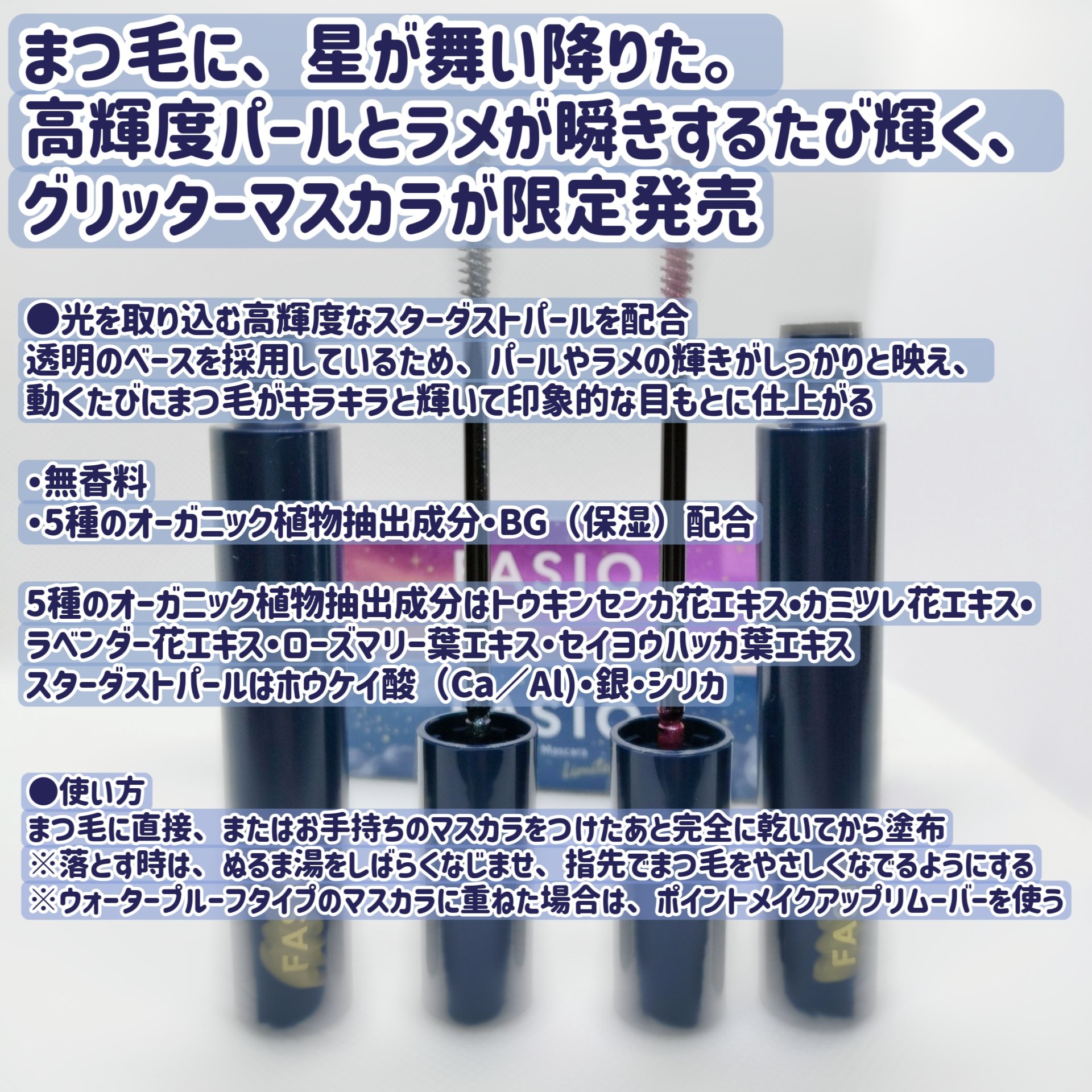 高輝度パールとラメが瞬きするたび輝く、グリッターマスカラが限定発売! 冬の星空をイメージした2色展開☃️🩷🩵 光に当たるたびにきらきらっと煌めく目元が演出できてとても素敵なマスカラです👀💗