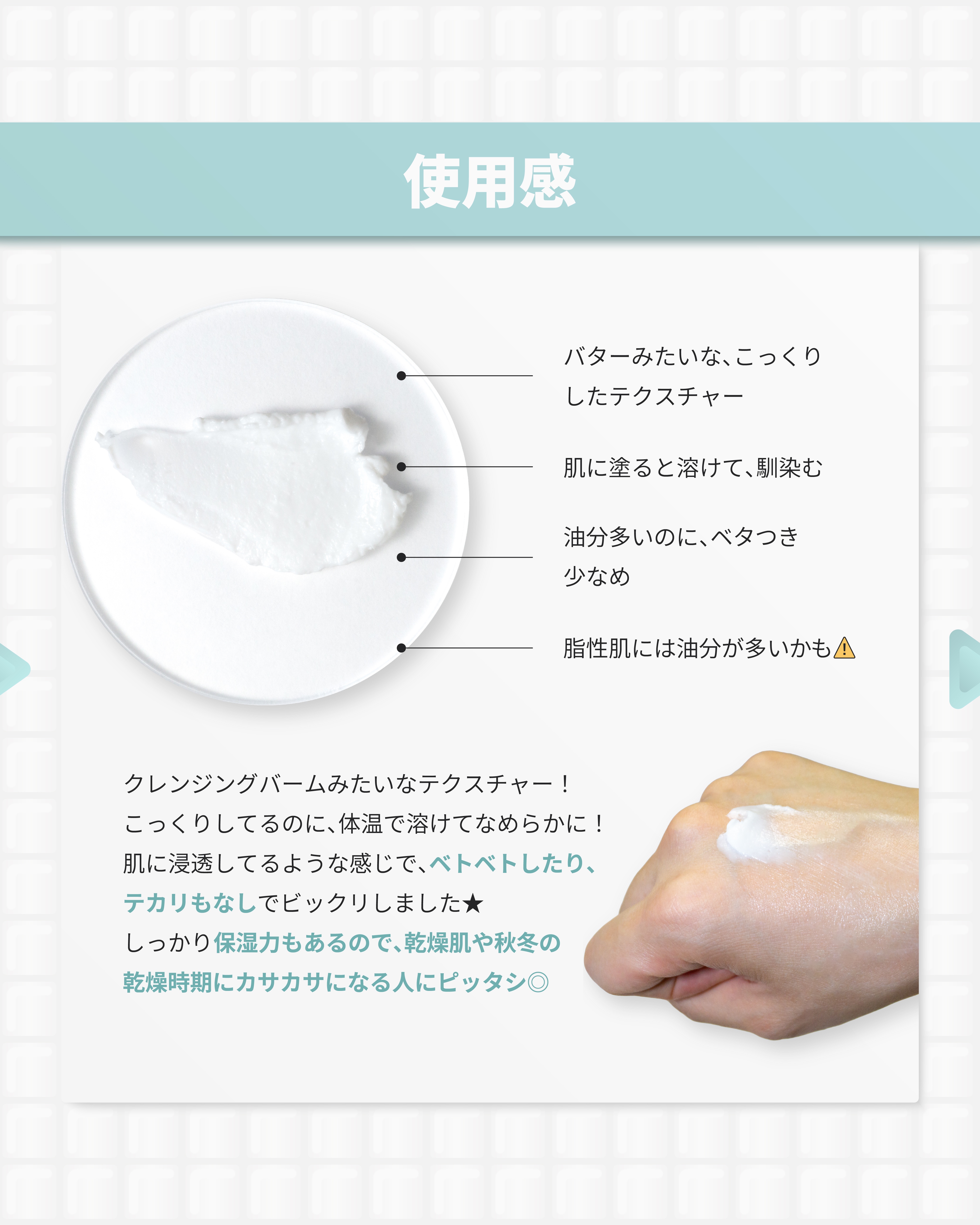 | クリームは軽いテクスチャーで、肌にのせるとスッと馴染み、べたつかないので朝晩どちらも使いやすいです。 | 詳細を見る | ||