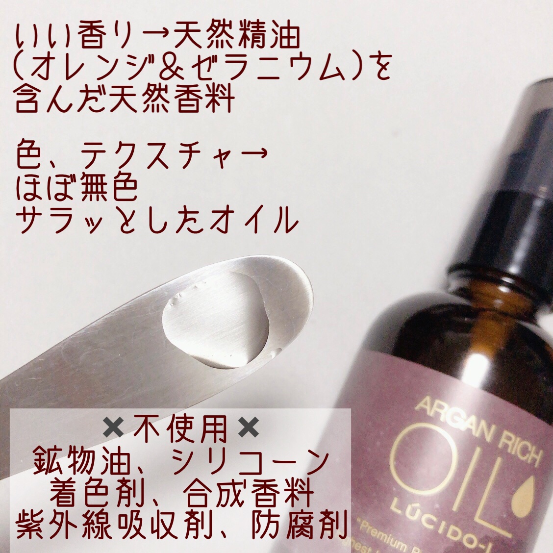 アルガンオイルが入った植物由来100%のヘアオイル テクスチャーは、オイルのしっとり感がしっかりと感じられるのですが 香りもオレンジ精油とゼラニウム精油のさわやかですっきりした香りでリフレッシュ&癒されます