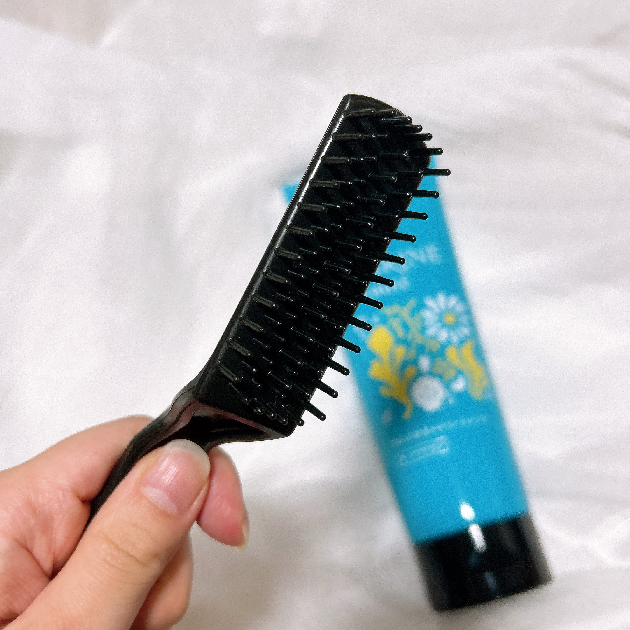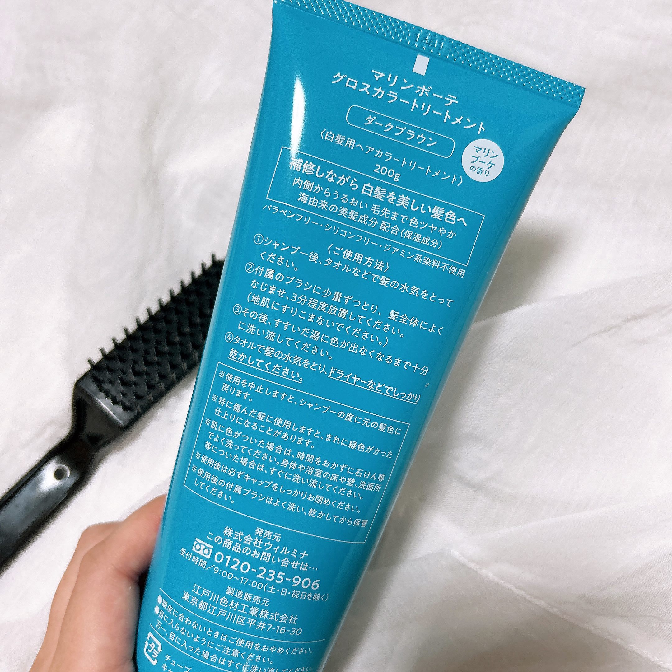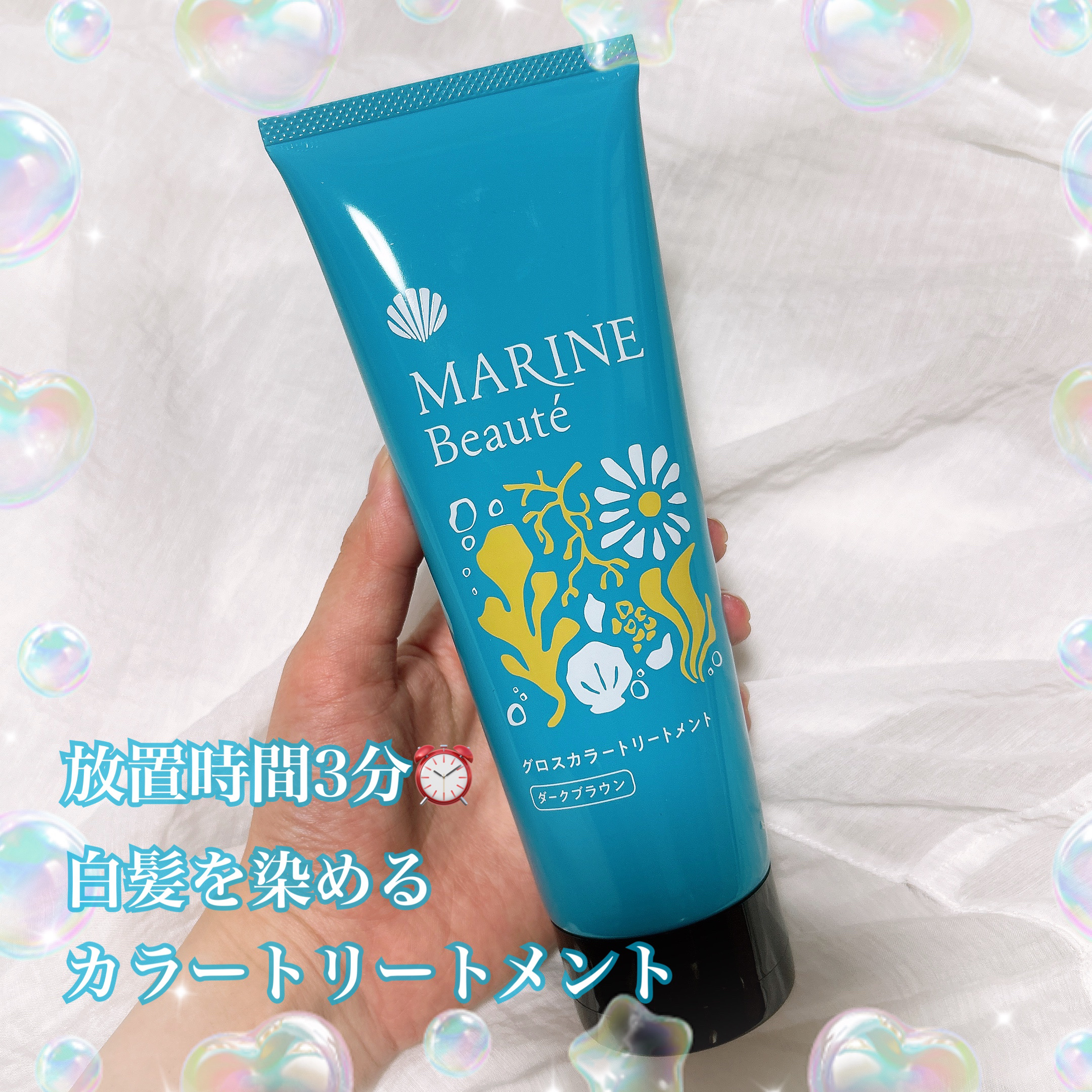 海由来美容成分12種&マリンブーケの香り、ということだそう 濡れた手でもOKで放置時間は3分(使用時間の目安として) ブラシがまた使いやすくてこの荒さがほどよくて髪にするするのばせます