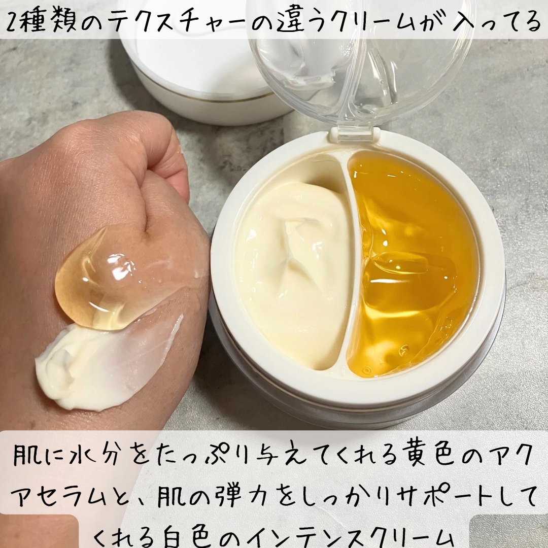 肌に必要な水分をたっぷりと与えてくれる黄色のアクアセラムと、肌の弾力をしっかりサポートしてくれる白色のインテンスクリームを組み合わせた楽しいクリーム♥️ アクアセラムは軽やかなジェル状で、みずみずしい塗り心地が魅力的😆 どちらもベタつかないテクスチャーで、塗りたてはしっとり。メイク前に使っても良さそう😊