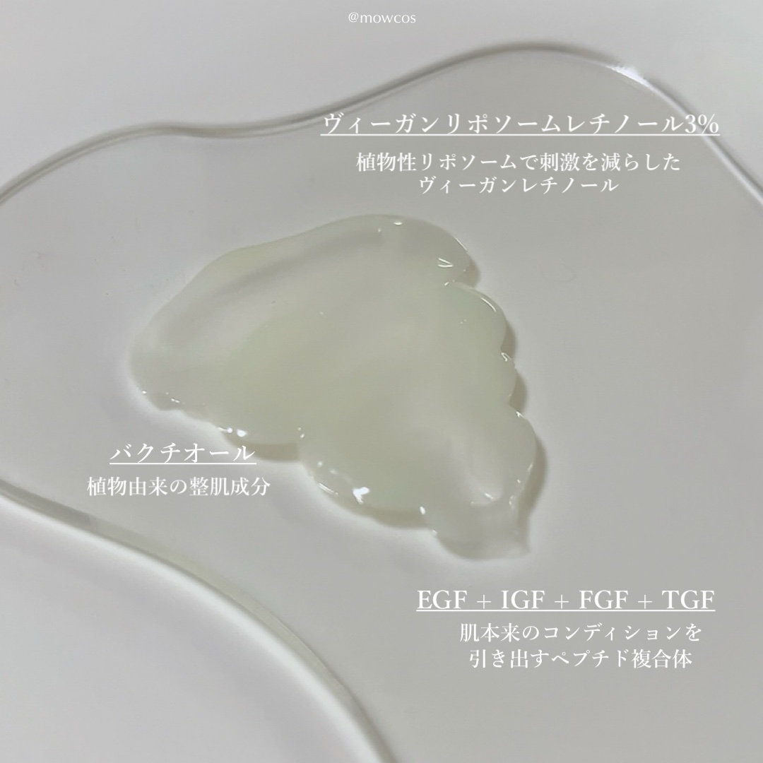 - <ヴィーガンリポソームレチノールセラム> 水、BG、エチルヘキサン酸セテアリル、グリセリン、メチルプロパンジオール、トリ( カプリル酸/カプリン酸)グリセリル、マカデミアナッツ、水添レシチン、アブラナステロールズ、レチノール、1,2−ヘキサンジオール、ラウリン酸ポリグリセリル−10、コレステロール、ラウロイルグルタミン酸ジ(オクチルドデシル/フィトステリル/ベヘニル)、テトラ(ジ−t−ブチルヒドロキシヒドロケイヒ酸)ペンタエリスリチル、ステアリン酸水酸化(Al/Mg)、セチルリン酸K、キトサン、クエン酸トリス(テトラメチルヒドロキシピペリジノール)、スクワラン、パンテノール、ジステアリン酸ポリグリセリル−3、クエン酸ステアリン酸グリセリル、クロレラエキス、グルコース、フルクトオリゴ糖、フルクトース、エチルヘキシルグリセリン、(アクリル酸ヒドロキシエチル/アクリロイルジメチルタウリンNa)コポリマー、ベタイン、ポリアクリレートクロスポリマー−6、β−グルカン、(アクリレーツ/アクリル酸アルキル(C10−30))クロスポリマー、トロメタミン、キサンタンガム、メリアアザジラクタ花エキス、カミメボウキ葉エキス、メリアアザジラクタ葉エキス、ウコン根エキス、サンゴモエキス、トコフェロール、アデノシン、アラントイン、カルボマー、乳酸Na、ポリソルベート20、パルミトイルトリペプチド−1、パルミトイルテトラペプチド−7、ヒアルロン酸Na、バクチオール、合成ヒト遺伝子組換デカペプチド−7、合成ヒト遺伝子組換オクタペプチド−4、合成ヒト遺伝子組換ポリペプチド−3、合成ヒト遺伝子組換オリゴペプチド−2、合成ヒト遺伝子組換ポリペプチド−1、合成ヒト遺伝子組換オリゴペプチド−1、合成ヒト遺伝子組換ポリペプチド−22