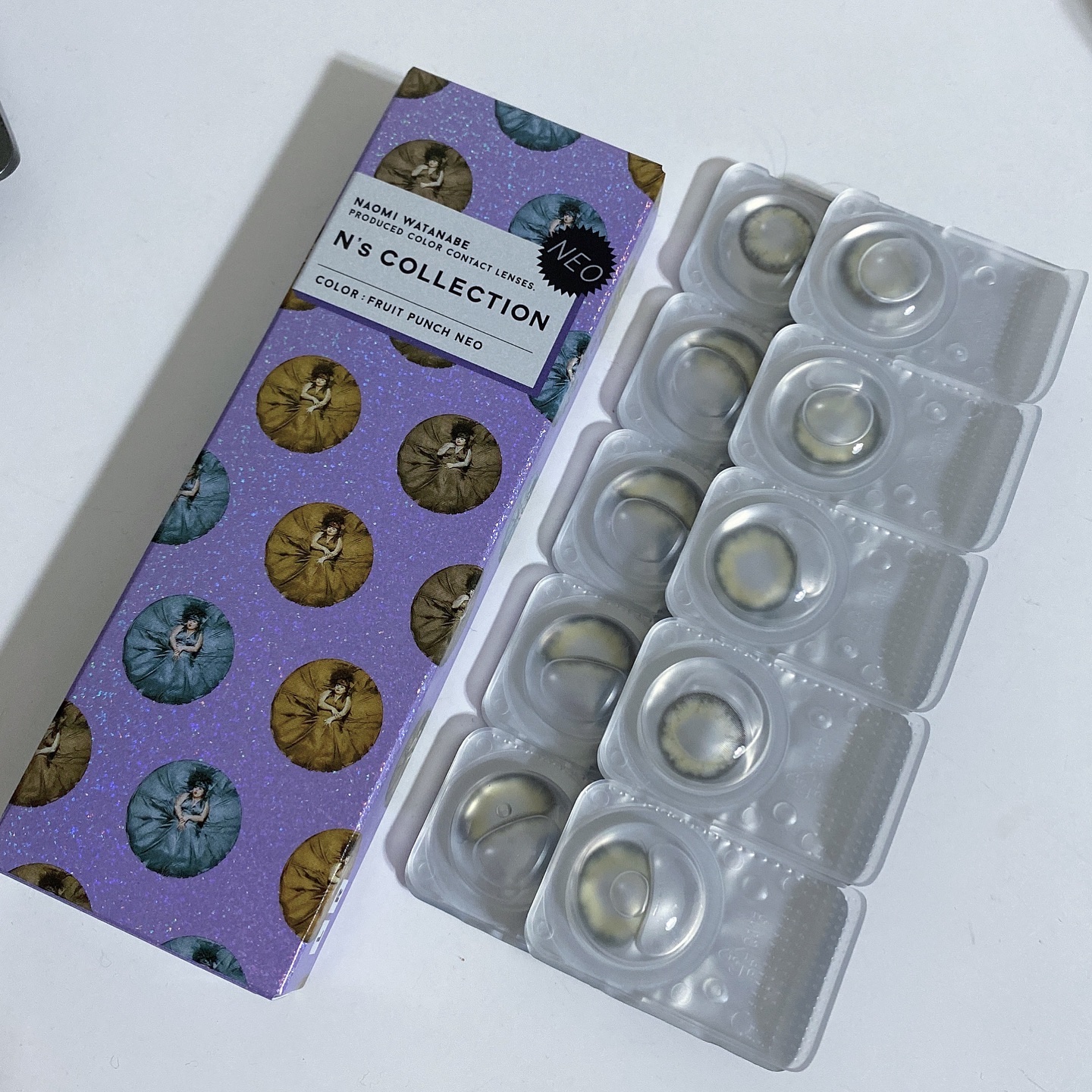 新色2色はエヌズコレクションの人気色ラッシーとフルーツポンチのサイズ感を大きく、フチをプラスしてより盛れるようになったネオシリーズ。 高発色のシルバーグレーにくっきりしたフチをプラスしてクールな印象に。裸眼が明るい茶目の私がつけると青みグレーに発色しました! フチありですが、ふんわりした細フチデザインなので瞳に馴染みやすくナチュラルに盛れます!