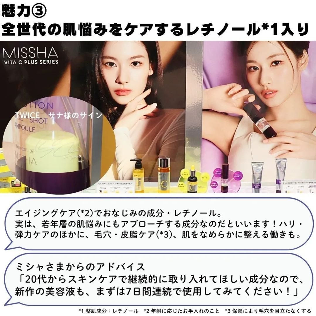 大人気のミシャからレチノール美容液が新発売されたの知ってた?💭 カチフル容器使う前に2層になっている美容液を混ぜて使うからフレッシュな美容液なの❤︎ TWICEサナちゃんのように、うるおいで透明感あふれるベビースキンを目指せるよ❤︎