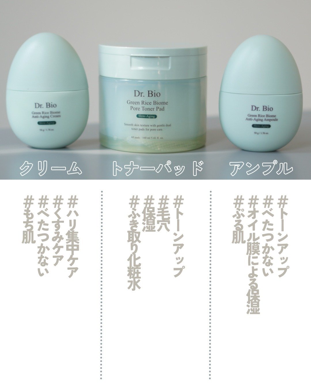 敏感肌、乾燥肌のために作られていて 韓国で10秒に1個売れているらしい大人気のブランドDr.Bio✨ トナーパッドは液がたっぷり入っていて メッシュ素材のシートで肌触りが良い✨ 保湿、角質、鎮静、トーンアップとマルチにケアできちゃう♡ なんといっても絶妙なかわいい緑パケところんっとしたフォルム。お米をモチーフにしているみたいで並べて見てるだけでうっとりしてしまう🥰