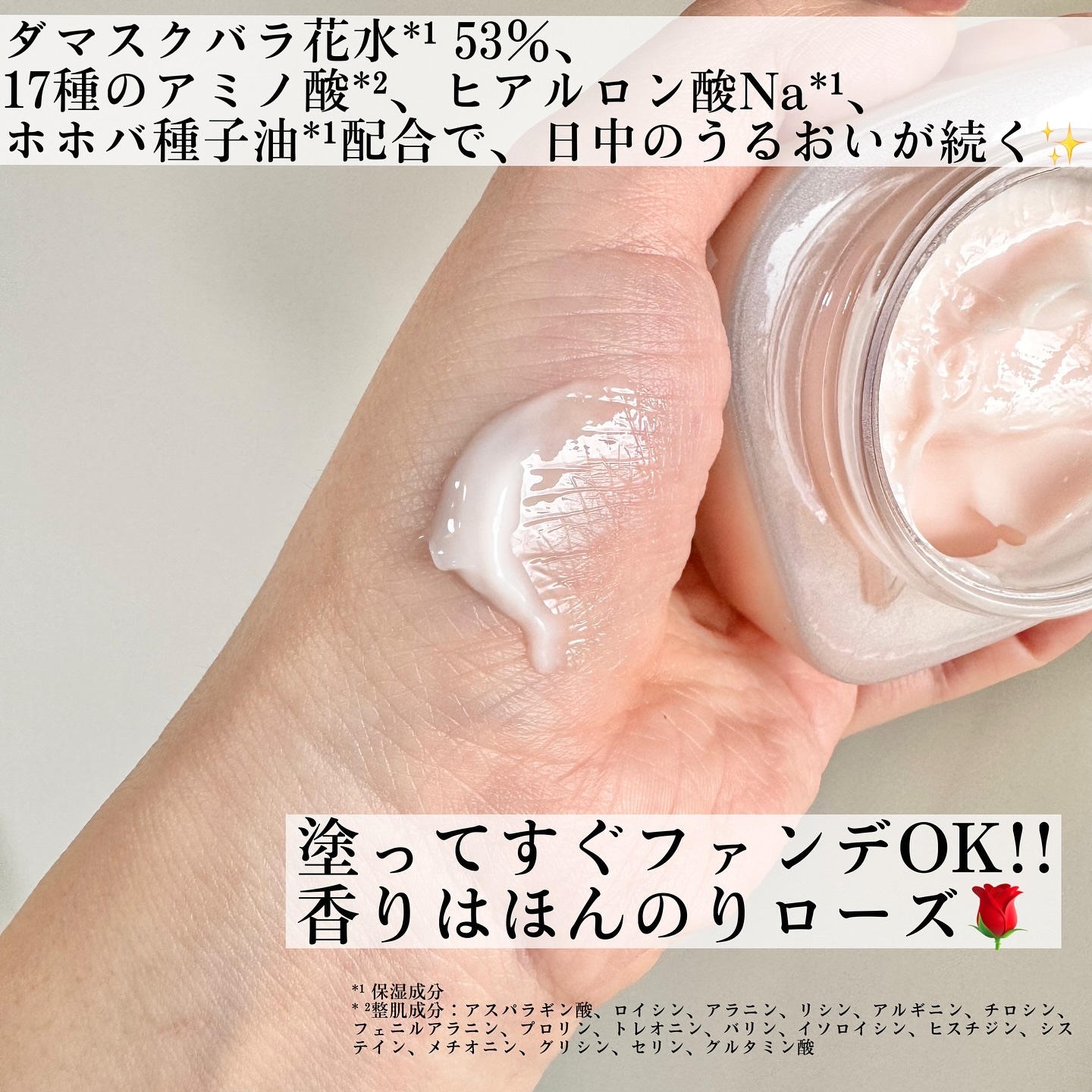 - ※2025年9月以降、商品パッケージ・一部成分を順次リニューアル。尚、これにかかる商品の返品・交換は承っておりません。 忙しい朝にも簡単、艶仕込み!うるおい溢れて、メイク長持ち化粧下地 1.化粧下地×フェイスクリーム フェイスクリームに化粧下地効果が備わり、忙しい朝の時短を実現。高保湿なのにベタつかず、乾燥によるメイク崩れを防ぎます。 2.艶肌仕込み 肌のキメに沿ってバームをなじませることで、なめらかな艶肌を演出。スキンケアの最後に仕込むことで、艶肌の土台が完成します。 3.ダマスクバラ花水(*1)57%配合 スキンケア効果に優れたダマスクバラ花水(*1)を57%配合することで、みずみずしいテクスチャーのバームが実現。うるおい溢れる肌へと導きます。 4.美容液効果 ごわついた肌をやわらげる17種のアミノ酸(*2)のみならず、ヒアルロン酸Na(*1)、ナイアシンアミド(*3)、加水分解コラーゲン(*1)配合。外的刺激(*4)によるトラブルを防ぎ、肌を健やかに整えます。 5.こんな方におすすめ ・ベースメイクの乾燥崩れにお悩みの方 ・忙しい朝でも素早く艶肌メイクを完成させたい方 ・高保湿の化粧下地をお探しの方 *1 保湿成分 *2 保湿成分:グリシン、セリン、グルタミン酸、アスパラギン酸、ロイシン、アラニン、リシン、アルギニン、チロシン、フェニルアラニン、バリン、トレオニン、プロリン、イソロイシン、ヒスチジン、メチオニン、システイン *3 整肌成分 *4 乾燥、大気中のちり、ほこりなど