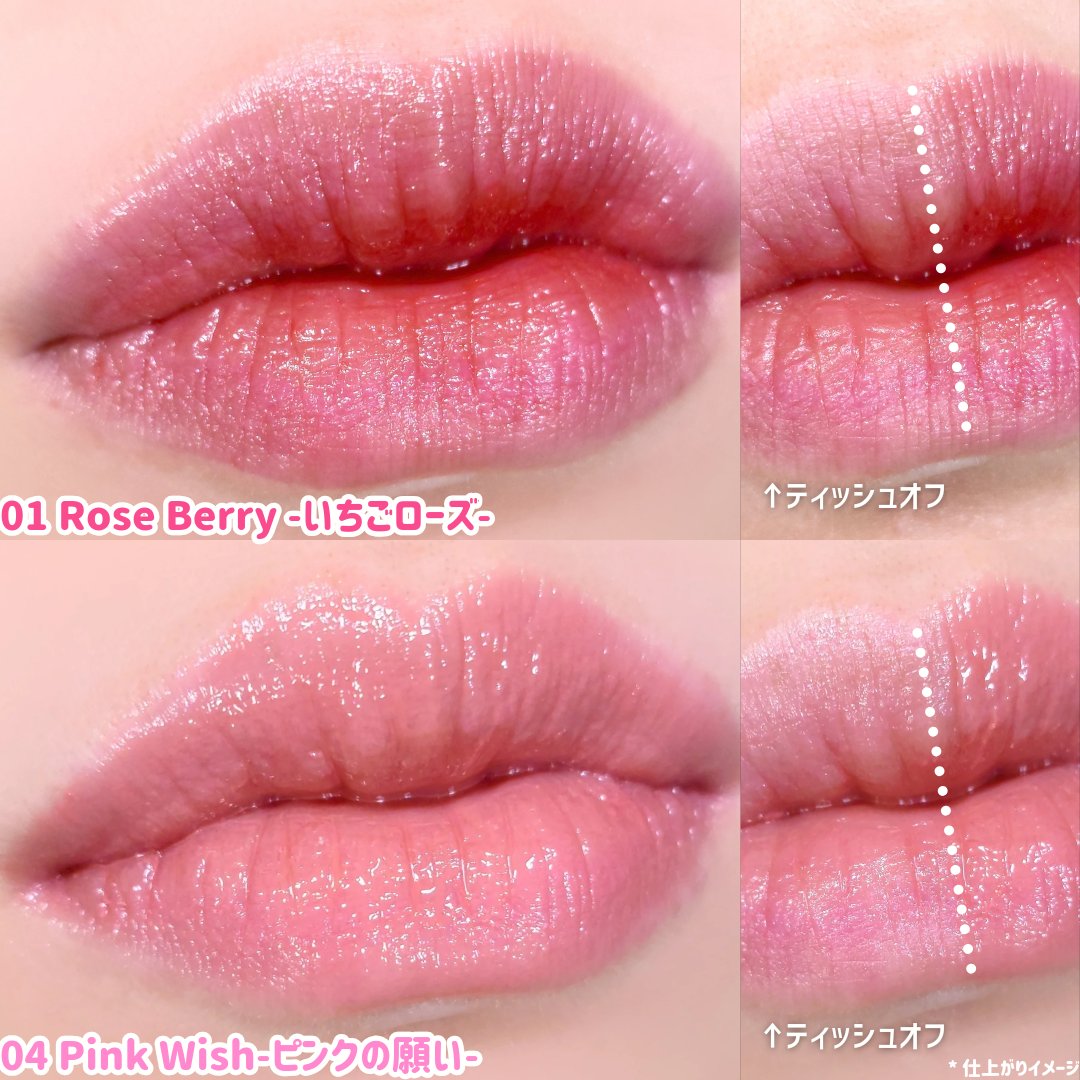 - ・じゅわっと透明感*¹ ある美発色 ティントでありながらも自然なリップカラーを演出。 見たまま美発色で唇を彩り、グロウなテクスチャーでありながらカラーフィクシングが可能。 ・ひと塗りでボリューム感*¹ と、とろける光沢感を演出 独自成分*² により反射光を効果的に演出し、唇の皺を見えにくくする。 また、モイスチャー感と光沢感もキープし、生ツヤっぽい光沢感を演出。 ・クリアなレイヤリングカラー 厚みのない、塗れば塗るほどきれいな発色。 ヌーディ系のライトとミュートカラー展開。 *¹ メイクアップ効果 *² アルミナ成分