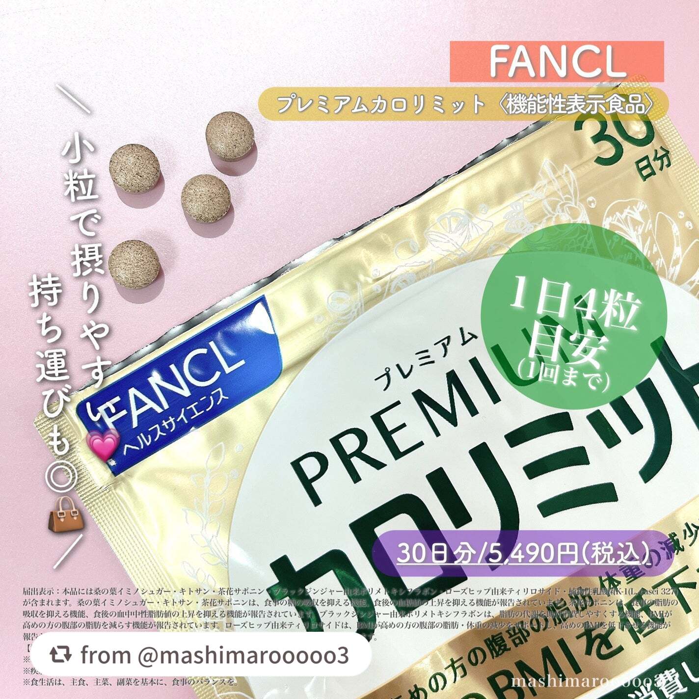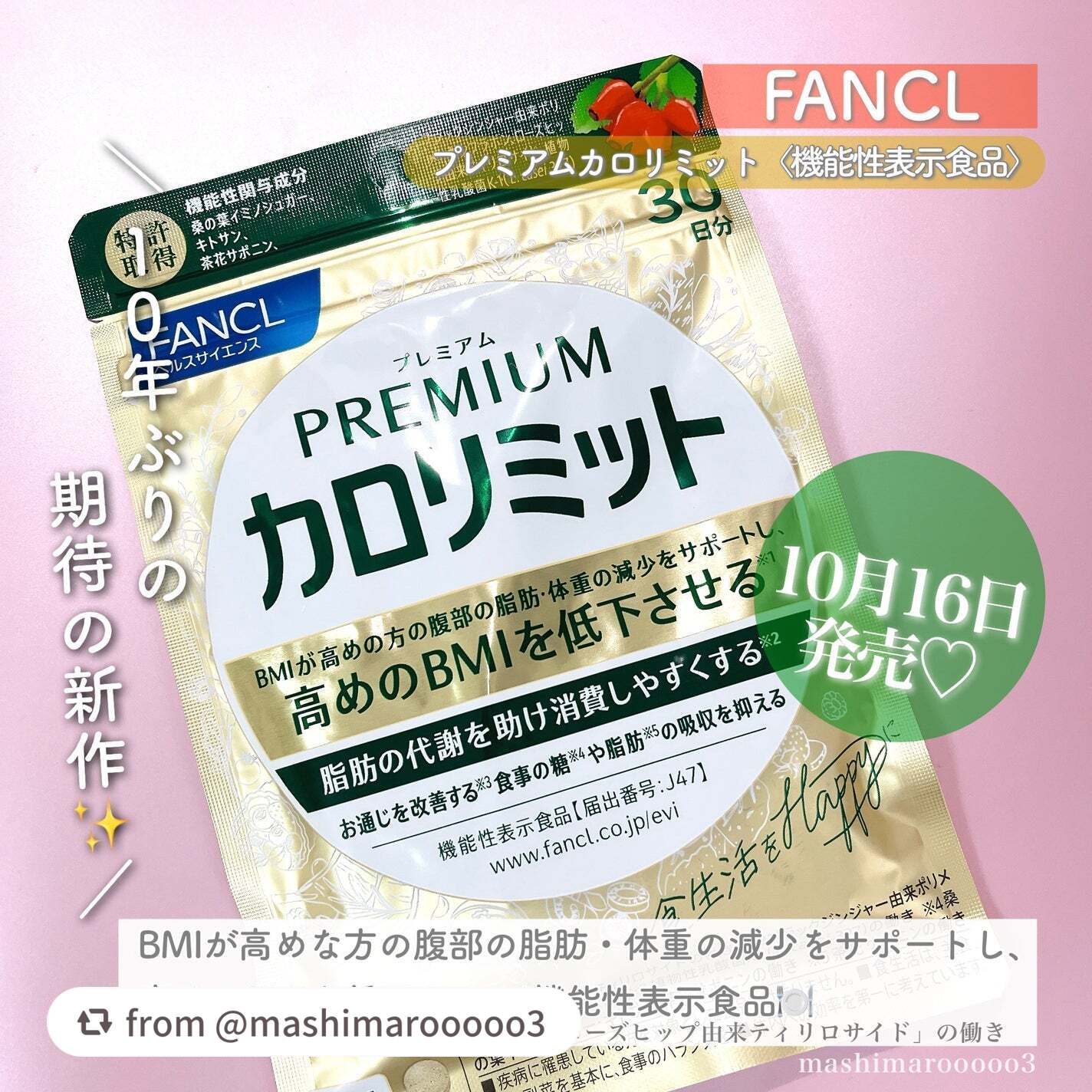 - 【機能性表示食品】 おいしく幸せに食べたい気持ちをサポートするファンケル「カロリミット」ブランドに本気で取り組みたい人に向けた“カロリミット史上最強”の製品が誕生 <お客様の「変わりたい」をサポートする製品設計> カロリミットブランドが持つ、糖と脂肪の吸収を抑える食事サポート機能はそのままに、お客様の変わりたいというニーズをサポートするために、新たに高めの BMI を低下させる機能が報告されている「ローズヒップ由来ティリロサイド」を加えました。 またお通じを改善する機能が報告されている「植物性乳酸菌 K-1(L. casei 327)」を配合。 (届出表示) 本品には桑の葉イミノシュガー・キトサン・茶花サポニン・ブラックジンジャー由来ポリメトキシフラボン・ローズヒップ由来ティリロサイド・植物性乳酸菌K-1(L. casei 327)が含まれます。 桑の葉イミノシュガー・キトサン・茶花サポニンは、食事の糖の吸収を抑える機能、食後の血糖値の上昇を抑える機能が報告されています。茶花サポニンは、食事の脂肪の吸収を抑える機能、食後の血中中性脂肪値の上昇を抑える機能が報告されています。ブラックジンジャー由来ポリメトキシフラボンは、脂肪の代謝を助け消費しやすくする機能、BMIが高めの方の腹部の脂肪を減らす機能が報告されています。ローズヒップ由来ティリロサイドは、BMIが高めの方の腹部の脂肪・体重の減少をサポートし、高めのBMIを低下させる機能が報告されています。 植物性乳酸菌 K-1(L. casei 327)には、お通じを改善する機能が報告されています。 <継続しやすい製剤設計> 当社独自の製剤技術により、目安量の 1 日 4 粒を実現し、お客様に継続して摂取いただけるよう工夫しました。 併せて剤形のコーティング技術により、配合成分が持つ独特の臭いなどを抑え、食事の邪魔をしない設計にこだわりました。 <親しみやすさと高品質な印象を両立したパッケージデザイン> 製品特長が分かりやすく、選びやすいことに加え、カロリミットブランドが持つ明るく親しみやすい印象と上品な金色による高級・高品質な印象の両立にこだわりました。 【アレルゲン(28品目中)】 かに 【ご注意】 ※妊娠・授乳中の方、未成年の方はお召し上がりにならないでください。 ※本品は、特定保健用食品と異なり、消費者庁長官による個別審査を受けたものではありません。 ※疾病の診断、治療、予防を目的としたものではありません。 ※食生活は、主食、主菜、副菜を基本に、食事のバランスを。 9月下旬から順次、一部コンビニエンスストアやドラッグストア、EC モールで先行発売を予定しています。