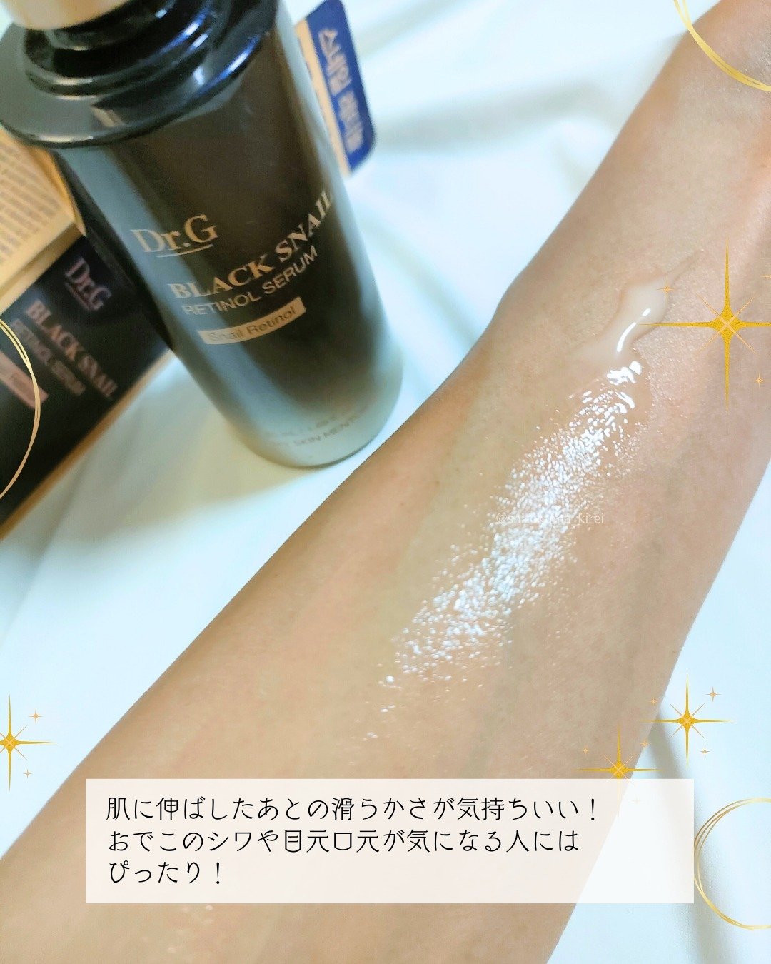 - ブラックスネイル*とレチノール*を配合した、若々しい肌印象に導く美容液です。 Dr.Gのレチノールは独自の成分である、ブラックスネイルレチノール*を使っています! 肌に高い保湿感を与え、肌のキメを整え、弾力やハリのケアを助けるだけでなく、肌の乾燥くすみをケアし、明るい印象のぷるんっとハリのある肌に導きます。 *整肌成分