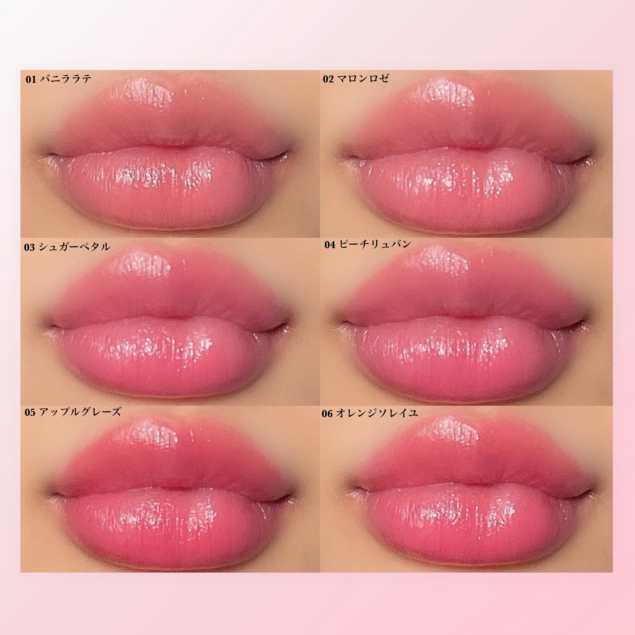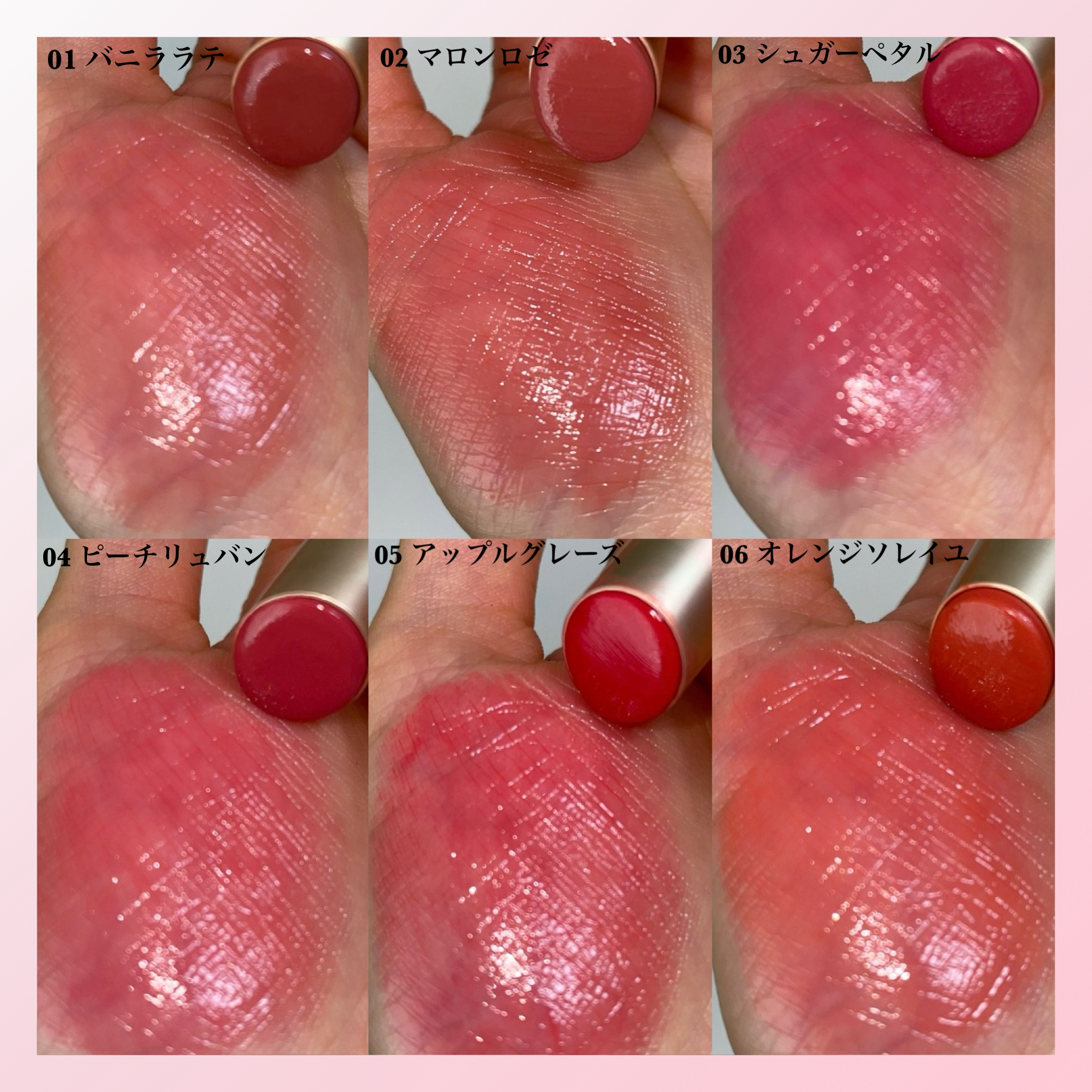 - <01 バニララテ> 水添ロジン酸メチル、オクチルドデカノール、テトラエチルヘキサン酸ペンタエリスリチル、ダイマージリノール酸ダイマージリノレイルビス(ベヘニル/イソステアリル/フィトステリル)、水添ポリイソブテン、トリ(カプリル酸/カプリン酸)グリセリル、合成ワックス、パラフィン、ビスジグリセリルポリアシルアジペート-2、ヒドロキシステアリン酸エチルヘキシル、水添ポリデセン、リンゴ酸ジイソステアリル、セチルPEG/PPG-10/1ジメチコン、酸化チタン、トリイソステアリン酸ポリグリセリル-2、ポリブテン、トリ酢酸テトラステアリン酸スクロース、(エチレン/プロピレン)コポリマー、ジメチルシリル化シリカ、黄4、カプリリルグリコール、カプリル酸グリセリル、マイクロクリスタリンワックス、香料、酸化鉄、キャンデリラロウ、赤227、エチルヘキシルグリセリン、シメチコン、ベルガモット果実油、アトラスシーダー樹皮エキス、トウシキミ果実/種子油、メドウフォーム種子油、ローズ油、ホホバ種子油、クエン酸、ジイソステアリン酸ポリグリセリル-2、テトラヘキシルデカン酸アスコルビル、トコフェロール、テトラ(ジ-t-ブチルヒドロキシヒドロケイヒ酸)ペンタエリスリチル、赤218、赤202 <02 マロンロゼ> 水添ロジン酸メチル、オクチルドデカノール、テトラエチルヘキサン酸ペンタエリスリチル、ダイマージリノール酸ダイマージリノレイルビス(ベヘニル/イソステアリル/フィトステリル)、水添ポリイソブテン、トリ(カプリル酸/カプリン酸)グリセリル、合成ワックス、パラフィン、ビスジグリセリルポリアシルアジペート-2、ヒドロキシステアリン酸エチルヘキシル、水添ポリデセン、リンゴ酸ジイソステアリル、酸化チタン、セチルPEG/PPG-10/1ジメチコン、ポリブテン、トリ酢酸テトラステアリン酸スクロース、酸化鉄、トリイソステアリン酸ポリグリセリル-2、(エチレン/プロピレン)コポリマー、ジメチルシリル化シリカ、カプリリルグリコール、カプリル酸グリセリル、マイクロクリスタリンワックス、香料、キャンデリラロウ、エチルヘキシルグリセリン、シメチコン、ベルガモット果実油、アトラスシーダー樹皮エキス、トウシキミ果実/種子油、メドウフォーム種子油、ローズ油、ホホバ種子油、ジイソステアリン酸ポリグリセリル-2、クエン酸、テトラヘキシルデカン酸アスコルビル、トコフェロール、テトラ(ジ-t-ブチルヒドロキシヒドロケイヒ酸)ペンタエリスリチル、赤202、黄5、赤218 <03 シュガーペタル> 水添ロジン酸メチル、オクチルドデカノール、テトラエチルヘキサン酸ペンタエリスリチル、ダイマージリノール酸ダイマージリノレイルビス(ベヘニル/イソステアリル/フィトステリル)、水添ポリイソブテン、トリ(カプリル酸/カプリン酸)グリセリル、合成ワックス、パラフィン、ビスジグリセリルポリアシルアジペート-2、ヒドロキシステアリン酸エチルヘキシル、水添ポリデセン、リンゴ酸ジイソステアリル、酸化チタン、セチルPEG/PPG-10/1ジメチコン、トリイソステアリン酸ポリグリセリル-2、ポリブテン、トリ酢酸テトラステアリン酸スクロース、酸化鉄、(エチレン/プロピレン)コポリマー、ジメチルシリル化シリカ、黄4、カプリリルグリコール、カプリル酸グリセリル、マイクロクリスタリンワックス、香料、赤202、キャンデリラロウ、ジイソステアリン酸ポリグリセリル-2、エチルヘキシルグリセリン、シメチコン、ベルガモット果実油、アトラスシーダー樹皮エキス、トウシキミ果実/種子油、メドウフォーム種子油、ローズ油、ホホバ種子油、クエン酸、テトラヘキシルデカン酸アスコルビル、トコフェロール、テトラ(ジ-t-ブチルヒドロキシヒドロケイヒ酸)ペンタエリスリチル、赤218 <04 ピーチリュバン> 水添ロジン酸メチル、オクチルドデカノール、テトラエチルヘキサン酸ペンタエリスリチル、ダイマージリノール酸ダイマージリノレイルビス(ベヘニル/イソステアリル/フィトステリル)、水添ポリイソブテン、トリ(カプリル酸/カプリン酸)グリセリル、合成ワックス、パラフィン、ビスジグリセリルポリアシルアジペート-2、ヒドロキシステアリン酸エチルヘキシル、水添ポリデセン、リンゴ酸ジイソステアリル、セチルPEG/PPG-10/1ジメチコン、酸化チタン、トリイソステアリン酸ポリグリセリル-2、ポリブテン、トリ酢酸テトラステアリン酸スクロース、(エチレン/プロピレン)コポリマー、黄4、ジメチルシリル化シリカ、カプリリルグリコール、カプリル酸グリセリル、マイクロクリスタリンワックス、香料、キャンデリラロウ、黄5、エチルヘキシルグリセリン、赤202、ジイソステアリン酸ポリグリセリル-2、シメチコン、ベルガモット果実油、アトラスシーダー樹皮エキス、トウシキミ果実/種子油、メドウフォーム種子油、ローズ油、ホホバ種子油、クエン酸、テトラヘキシルデカン酸アスコルビル、トコフェロール、テトラ(ジ-t-ブチルヒドロキシヒドロケイヒ酸)ペン