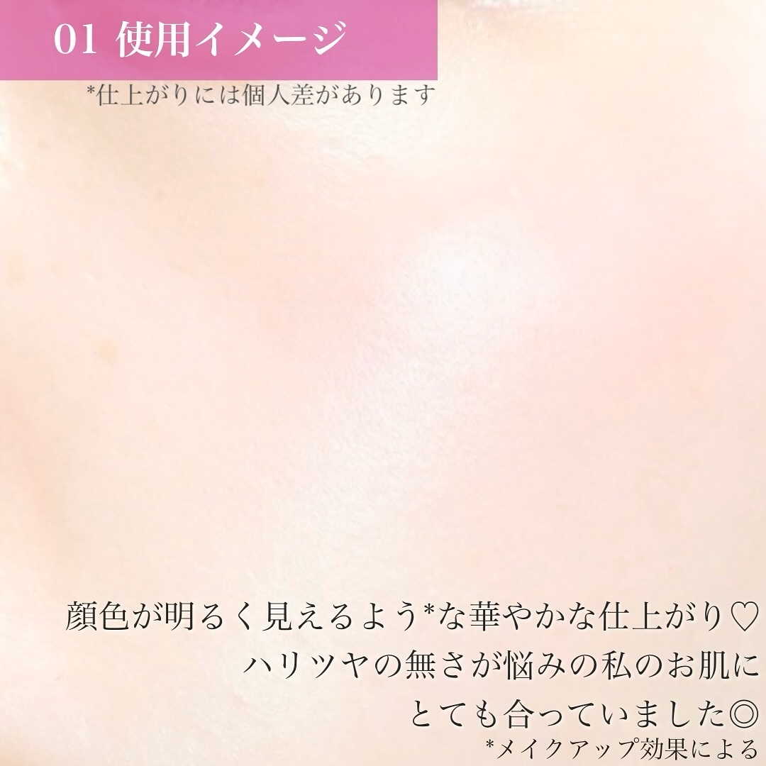 - 1. 部分的に塗布しただけで、全方位どこからみても、明るさのある美しい肌をつくる 独自のカラーパール層は、干渉パールと球状粉体を高配合しているため、光を広範囲に反射させることを可能に。 部分的に塗布するだけで、360°どこからみても明るさとツヤを放ちます。 また、透明感を引き出す青の効果を採用、年齢による黄ぐすみを目立ちにくくします※。 ※メイクアップ効果による 2.素肌から反射した光も味方につけた“透ける血色”。肌になじみ、顔全体からあふれるいきいき感。 透過性の高いパールにより素肌まで多くの光を取り込み反射するので、肌と一体化し、肌なじみの良い血色感を実現。 広範囲に塗布することができ、顔全体に血色という光をまとった明るさあふれる仕上がりになります。 3.その他の特長 ・どんな肌にもなじみやすい2色のカラー展開。 ・1日中美しい仕上がりが持続します。