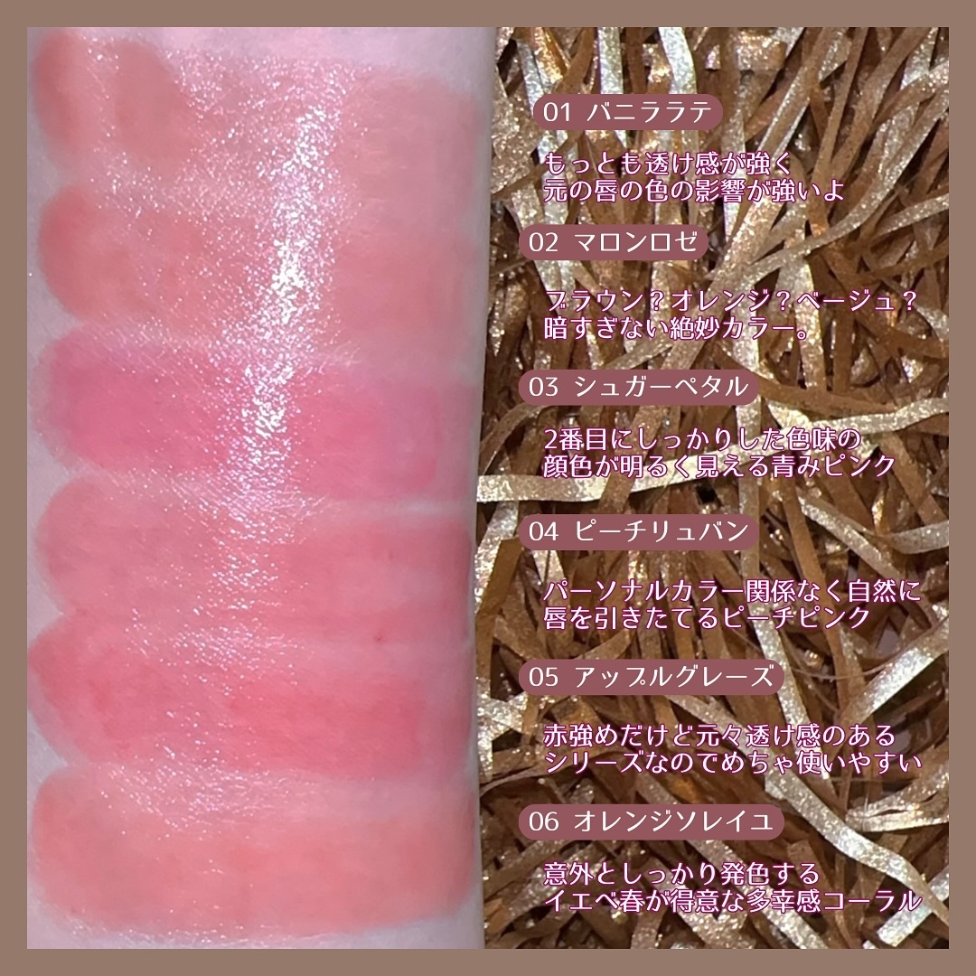 - <01 バニララテ> 水添ロジン酸メチル、オクチルドデカノール、テトラエチルヘキサン酸ペンタエリスリチル、ダイマージリノール酸ダイマージリノレイルビス(ベヘニル/イソステアリル/フィトステリル)、水添ポリイソブテン、トリ(カプリル酸/カプリン酸)グリセリル、合成ワックス、パラフィン、ビスジグリセリルポリアシルアジペート-2、ヒドロキシステアリン酸エチルヘキシル、水添ポリデセン、リンゴ酸ジイソステアリル、セチルPEG/PPG-10/1ジメチコン、酸化チタン、トリイソステアリン酸ポリグリセリル-2、ポリブテン、トリ酢酸テトラステアリン酸スクロース、(エチレン/プロピレン)コポリマー、ジメチルシリル化シリカ、黄4、カプリリルグリコール、カプリル酸グリセリル、マイクロクリスタリンワックス、香料、酸化鉄、キャンデリラロウ、赤227、エチルヘキシルグリセリン、シメチコン、ベルガモット果実油、アトラスシーダー樹皮エキス、トウシキミ果実/種子油、メドウフォーム種子油、ローズ油、ホホバ種子油、クエン酸、ジイソステアリン酸ポリグリセリル-2、テトラヘキシルデカン酸アスコルビル、トコフェロール、テトラ(ジ-t-ブチルヒドロキシヒドロケイヒ酸)ペンタエリスリチル、赤218、赤202 <02 マロンロゼ> 水添ロジン酸メチル、オクチルドデカノール、テトラエチルヘキサン酸ペンタエリスリチル、ダイマージリノール酸ダイマージリノレイルビス(ベヘニル/イソステアリル/フィトステリル)、水添ポリイソブテン、トリ(カプリル酸/カプリン酸)グリセリル、合成ワックス、パラフィン、ビスジグリセリルポリアシルアジペート-2、ヒドロキシステアリン酸エチルヘキシル、水添ポリデセン、リンゴ酸ジイソステアリル、酸化チタン、セチルPEG/PPG-10/1ジメチコン、ポリブテン、トリ酢酸テトラステアリン酸スクロース、酸化鉄、トリイソステアリン酸ポリグリセリル-2、(エチレン/プロピレン)コポリマー、ジメチルシリル化シリカ、カプリリルグリコール、カプリル酸グリセリル、マイクロクリスタリンワックス、香料、キャンデリラロウ、エチルヘキシルグリセリン、シメチコン、ベルガモット果実油、アトラスシーダー樹皮エキス、トウシキミ果実/種子油、メドウフォーム種子油、ローズ油、ホホバ種子油、ジイソステアリン酸ポリグリセリル-2、クエン酸、テトラヘキシルデカン酸アスコルビル、トコフェロール、テトラ(ジ-t-ブチルヒドロキシヒドロケイヒ酸)ペンタエリスリチル、赤202、黄5、赤218 <03 シュガーペタル> 水添ロジン酸メチル、オクチルドデカノール、テトラエチルヘキサン酸ペンタエリスリチル、ダイマージリノール酸ダイマージリノレイルビス(ベヘニル/イソステアリル/フィトステリル)、水添ポリイソブテン、トリ(カプリル酸/カプリン酸)グリセリル、合成ワックス、パラフィン、ビスジグリセリルポリアシルアジペート-2、ヒドロキシステアリン酸エチルヘキシル、水添ポリデセン、リンゴ酸ジイソステアリル、酸化チタン、セチルPEG/PPG-10/1ジメチコン、トリイソステアリン酸ポリグリセリル-2、ポリブテン、トリ酢酸テトラステアリン酸スクロース、酸化鉄、(エチレン/プロピレン)コポリマー、ジメチルシリル化シリカ、黄4、カプリリルグリコール、カプリル酸グリセリル、マイクロクリスタリンワックス、香料、赤202、キャンデリラロウ、ジイソステアリン酸ポリグリセリル-2、エチルヘキシルグリセリン、シメチコン、ベルガモット果実油、アトラスシーダー樹皮エキス、トウシキミ果実/種子油、メドウフォーム種子油、ローズ油、ホホバ種子油、クエン酸、テトラヘキシルデカン酸アスコルビル、トコフェロール、テトラ(ジ-t-ブチルヒドロキシヒドロケイヒ酸)ペンタエリスリチル、赤218 <04 ピーチリュバン> 水添ロジン酸メチル、オクチルドデカノール、テトラエチルヘキサン酸ペンタエリスリチル、ダイマージリノール酸ダイマージリノレイルビス(ベヘニル/イソステアリル/フィトステリル)、水添ポリイソブテン、トリ(カプリル酸/カプリン酸)グリセリル、合成ワックス、パラフィン、ビスジグリセリルポリアシルアジペート-2、ヒドロキシステアリン酸エチルヘキシル、水添ポリデセン、リンゴ酸ジイソステアリル、セチルPEG/PPG-10/1ジメチコン、酸化チタン、トリイソステアリン酸ポリグリセリル-2、ポリブテン、トリ酢酸テトラステアリン酸スクロース、(エチレン/プロピレン)コポリマー、黄4、ジメチルシリル化シリカ、カプリリルグリコール、カプリル酸グリセリル、マイクロクリスタリンワックス、香料、キャンデリラロウ、黄5、エチルヘキシルグリセリン、赤202、ジイソステアリン酸ポリグリセリル-2、シメチコン、ベルガモット果実油、アトラスシーダー樹皮エキス、トウシキミ果実/種子油、メドウフォーム種子油、ローズ油、ホホバ種子油、クエン酸、テトラヘキシルデカン酸アスコルビル、トコフェロール、テトラ(ジ-t-ブチルヒドロキシヒドロケイヒ酸)ペン