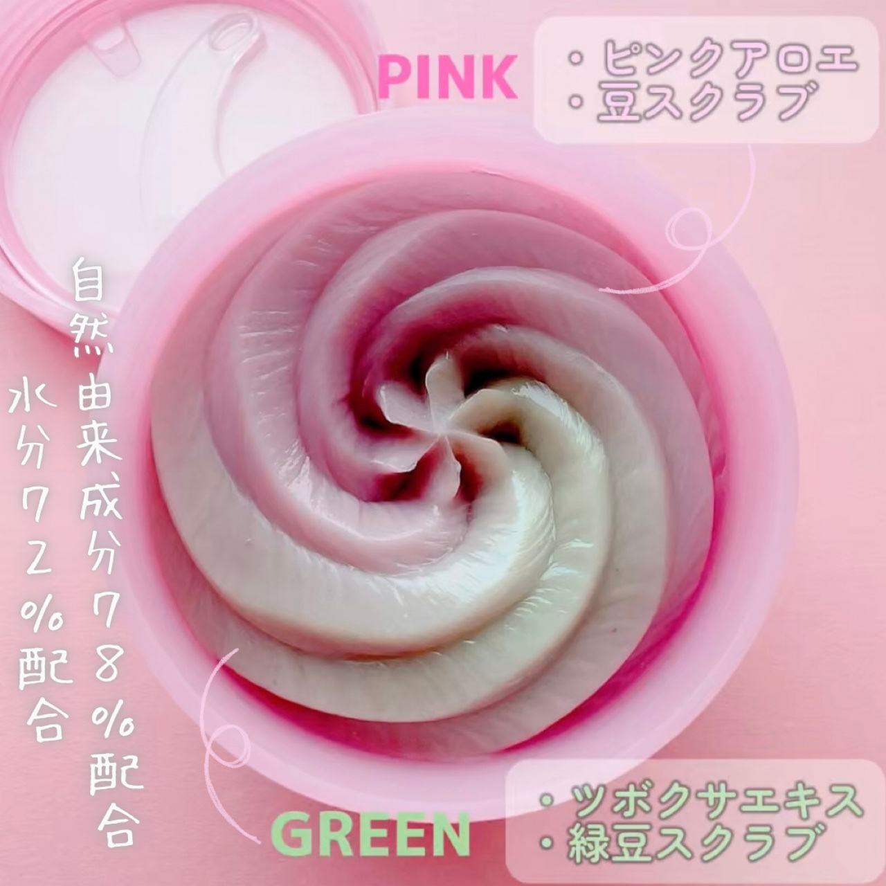 APRILSKINピンクアロエメレンゲクレンザー洗顔、パックにも使える新感覚2wayクレンザー🫧ピンクアロエや豆スクラブ、グリーンの部分はツボクサエキスや緑豆スクラブなどが配合されてるみたい🌿✨肌表面のザラつきを滑らかにしてくれて、汚れもスッ...
