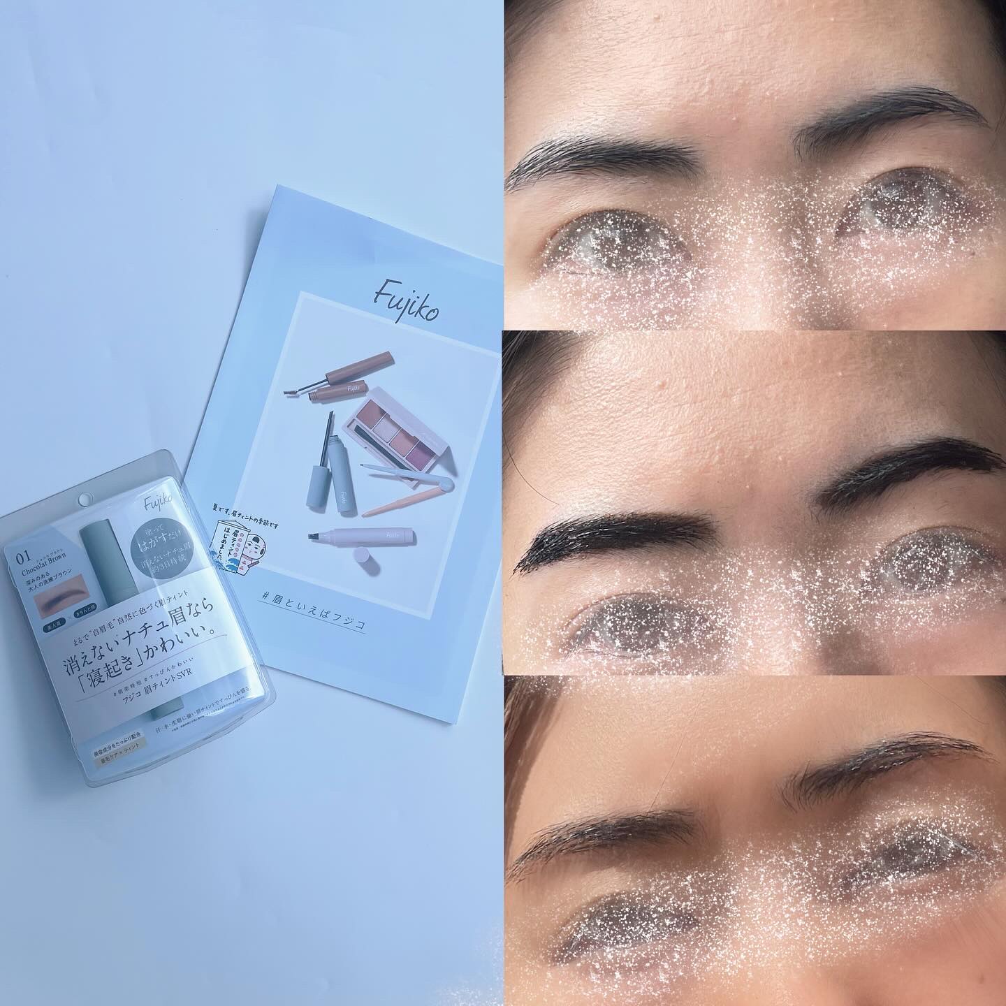 フジコ眉ティント 01ショコラブラウン 1,485円 (税込)です。眉ティント??ちょっと使いにくそう……、めっちゃ濃くなるのでは?って思ってたけど、これがすっごく使いやすかった✨ カラーが絶妙だから垢抜け眉にもおすすめ👀💓 私のおすすめの使い方は、眉のベースに眉ティントを仕込んでおくこと! 5種の美容成分が配合されているから特に荒れることはなかったよ🌸