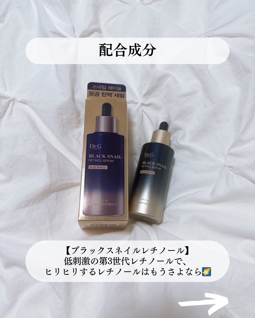 - ブラックスネイル*とレチノール*を配合した、若々しい肌印象に導く美容液です。 Dr.Gのレチノールは独自の成分である、ブラックスネイルレチノール*を使っています! 肌に高い保湿感を与え、肌のキメを整え、弾力やハリのケアを助けるだけでなく、肌の乾燥くすみをケアし、明るい印象のぷるんっとハリのある肌に導きます。 *整肌成分
