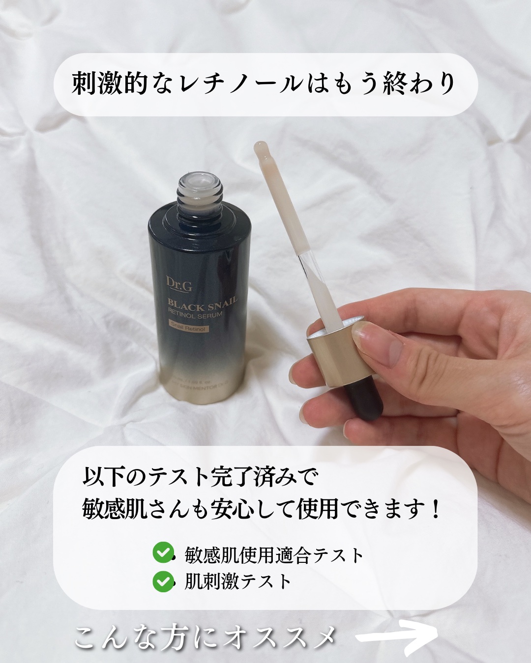 ブラックスネイル➕低刺激のレチノールを配合 6歳若返る弾力エイジングケアセラム💆🏻♀️ もっちりとしたテクスチャで、するんとお肌に馴染み1回の使用で効果を実感できました! 敏感肌使用適合テスト済み、肌刺激テスト済みだから肌荒れせず使用できました🌿