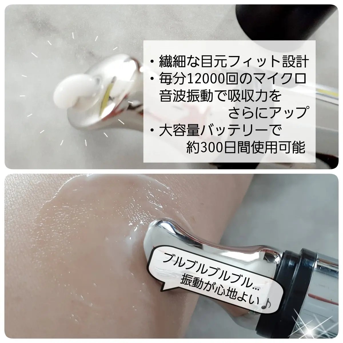 カルシウム 633,410 PPM配合 目元の弾力、ボリュームアップ 振動デバイスが付いている金属部分を持つと電源ON 毎分12000回のマイクロ音波振動で吸収力をさらにアップ