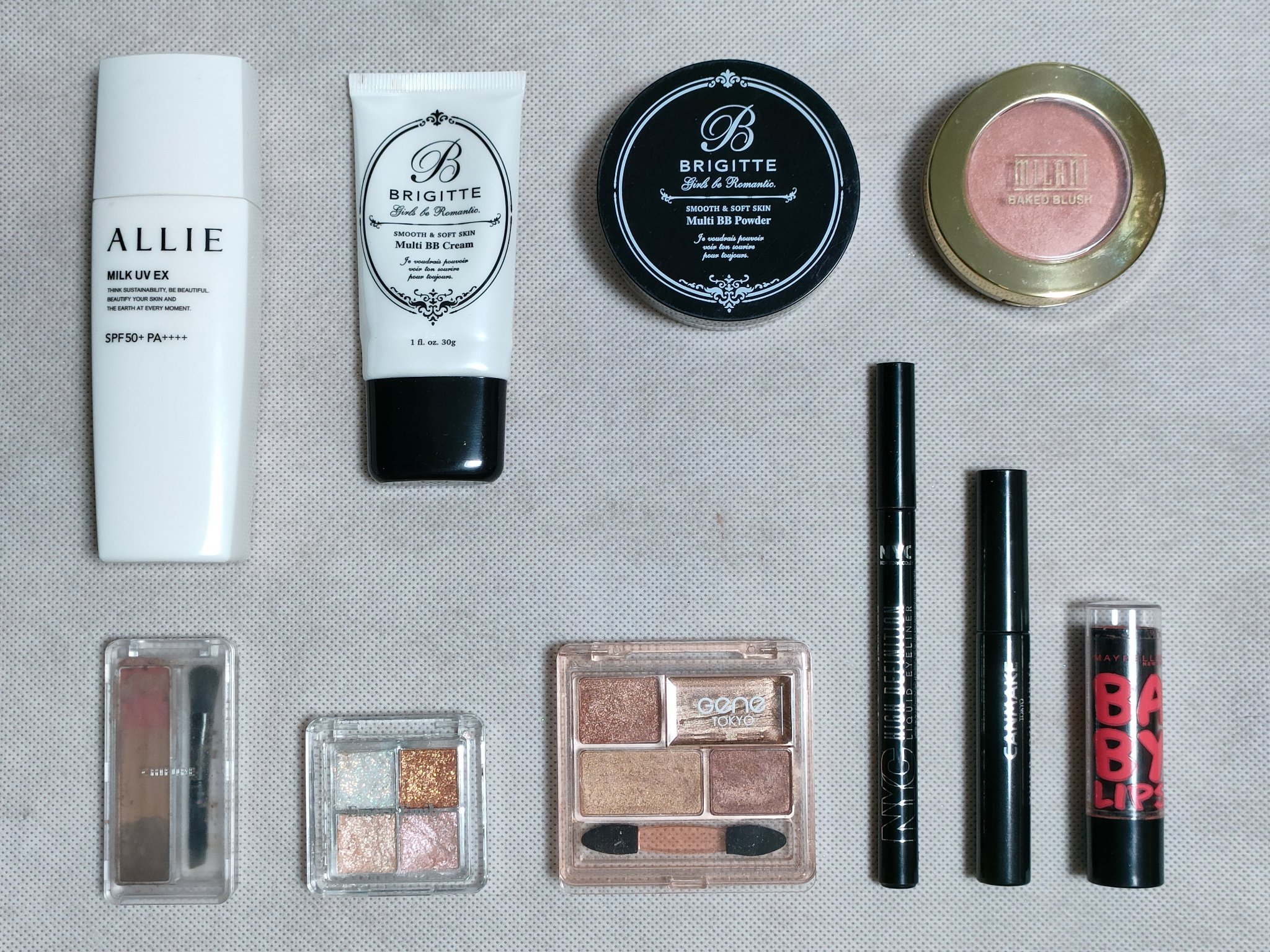 アリィー ニュアンスチェンジUV ジェル RSを、顔全体にまんべんなく塗ります。 RMK RMK ジェルクリーミィファンデーション 103を、顔全体にまんべんなく塗ります。 ジョンソンベビー ジョンソン ベビーパウダーを、顔全体にまんべんなく軽くはたきます。 THE BODY SHOP bronze shade warm glowを、両頬に塗ります。 KATE リフレクトミラーアイズ BR-1の締め色を、眉毛全体にまんべんなく塗ります。 URGLAM UR GLAMBLOOMING EYE COLOR PALETTE 01を、使用しました。 ちふれ リキッド アイライナー 筆ペンタイプ BK30 ブラックを、塗ります。 CEZANNE エアリーカールマスカラを、まつ毛全体にまんべんなく塗ります。 MAYBELLINE NEW YORK コロッサルボリュームエクスプレスを、まつ毛全体にまんべんなく塗ります。 MAYBELLINE NEW YORK SPステイ マットインク 135を、唇全体にまんべんなく塗ります。