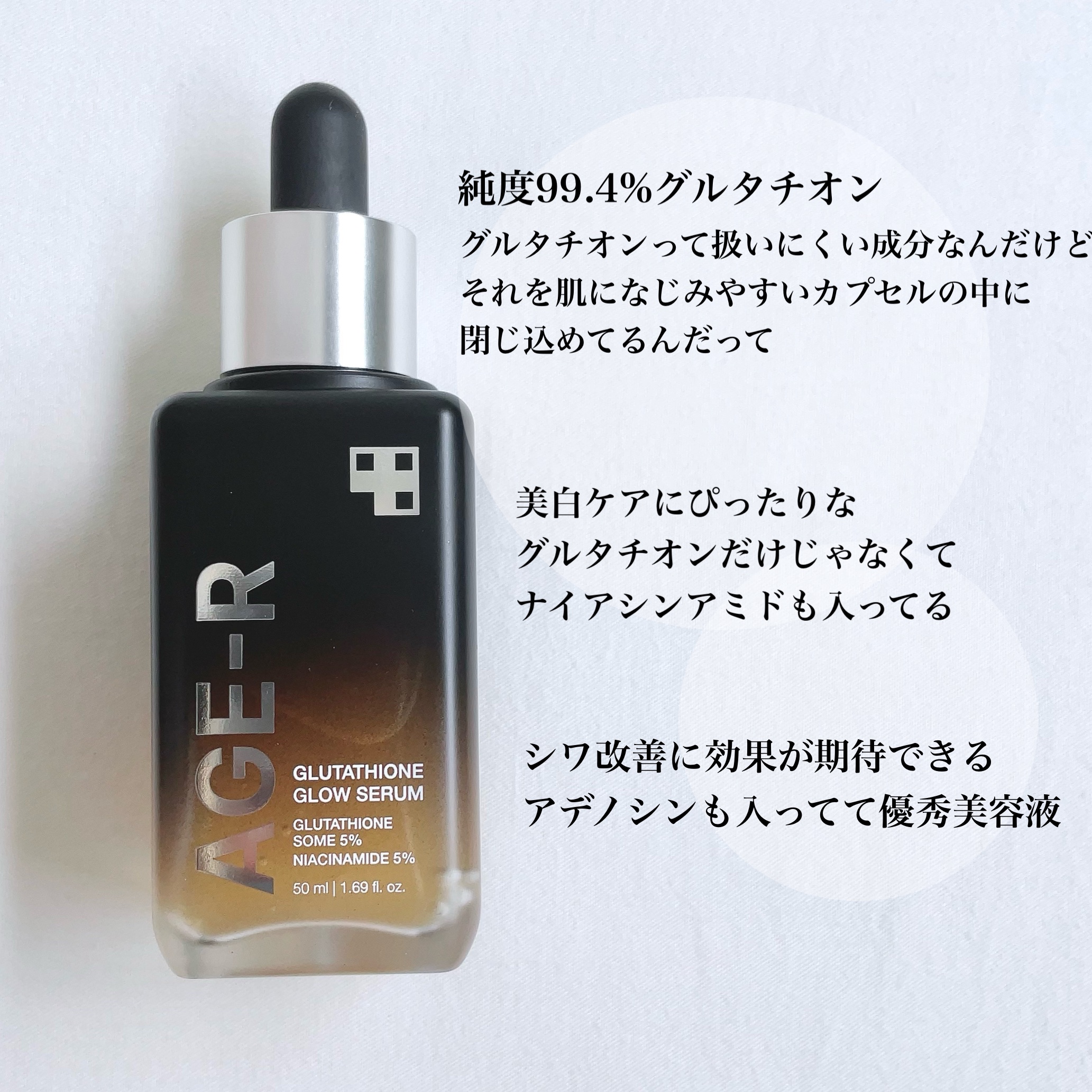 - 高純度99.4%のグルタチオン*を配合し、ハリツヤ肌に導く美容液です。 肌に馴染みやすいリン脂質製のカプセルにグルタチオン成分*を閉じ込め、肌の角質層までうるおいで満たします。 ☑グルタチオンソーム*:50,000ppm ☑ナイアシンアミド* 5%配合 ☑べたつかずしっとりツヤ肌 ☑美顔器AGE-R スキンブースターショットと一緒に使えます 化粧水などでお肌を整えたあと、適量を取り、お肌のキメに沿ってまんべんなく塗った後、やさしくなじませます。 *保湿成分 ■お肌に異常が生じていないかよく注意してご使用ください。化粧品がお肌に合わないとき即ち次のような場合には、使用を中止してください。そのまま使 用を続けますと、症状を悪化させることがありますので、皮膚科専門医等にご相談されることをおすすめします。また、傷やはれもの、しっしん等の異常が ある部位には、ご使用にならないでください。 (1)使用中、赤味、はれ、かゆみ、刺激、色抜け(白斑等)や黒ずみ等の異常があらわれた場合 (2)使用したお肌に、直射日光があたって上記のような異常があらわれた場合 ■目に入らないようご注意ください。目に入ったときは、こすらずにすぐに洗い流してください。その後、目に異物感など異常が残る場合は、眼科専門医へ ご相談されることをおすすめします。 ■極端に高温又は低温の場所、直射日光のあたる場所には保管しないでください。 ■開封後なるべく早めに使用してください。 ■ご使用後はフタをきちんと閉めてください。 ■乳児、子供の手の届かない所に保管してください。