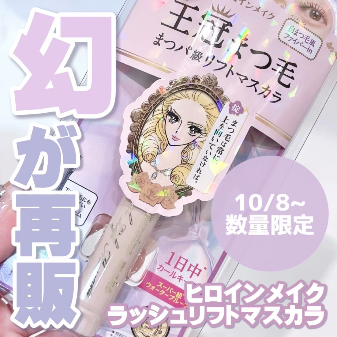 - 数量限定発売 ぐいっとまつパ級のリフト力で1日中※1カールキープ!ちゅるんとツヤ感&束感のある「王冠まつ毛」を叶えるコームマスカラが数量限定登場 ■まつパ級リフト、1日中※1キープ! まつ毛パーマのように根元から立ち上がり、毛先までダマなく美しい「王冠まつ毛」に。下まつ毛・目頭にも塗りやすいWコーム採用。 ■1日中※1カールキープ カールロック成分配合。塗った瞬間上向きカールを強力固定します。 ※1 日中の活動時間 ■スーパー級※2ウォータープルーフ 長時間にじまない!涙・汗・皮脂・こすれに強い独自の耐久処方。 ※2 ヒロインメイク マスカラ内で ■2種類の自まつ毛風ファイバーで軽やかロングへ 軽やかな仕上がりのエアリータッチファイバーと黒よりもやわらかい色味のナチュラルグレーファイバーを絶妙にMiX! 自まつ毛になじみやすく、自然なロングまつ毛に仕上げます。 ■濡れたようなツヤ感のゼリーブラック ちゅるんとしたツヤ感のある半透明な黒色で、軽やかなのに存在感のあるまつ毛に。 グロッシーパール配合できらめきをプラス。 ■6種のまつ毛美容液成分配合 ツバキオイル・ローヤルゼリーエキス・アルガンオイル ・野バラオイル※3・オタネニンジンエキス・アーモンドオイル(まつ毛保護成分) ※3 カニナバラ果実油