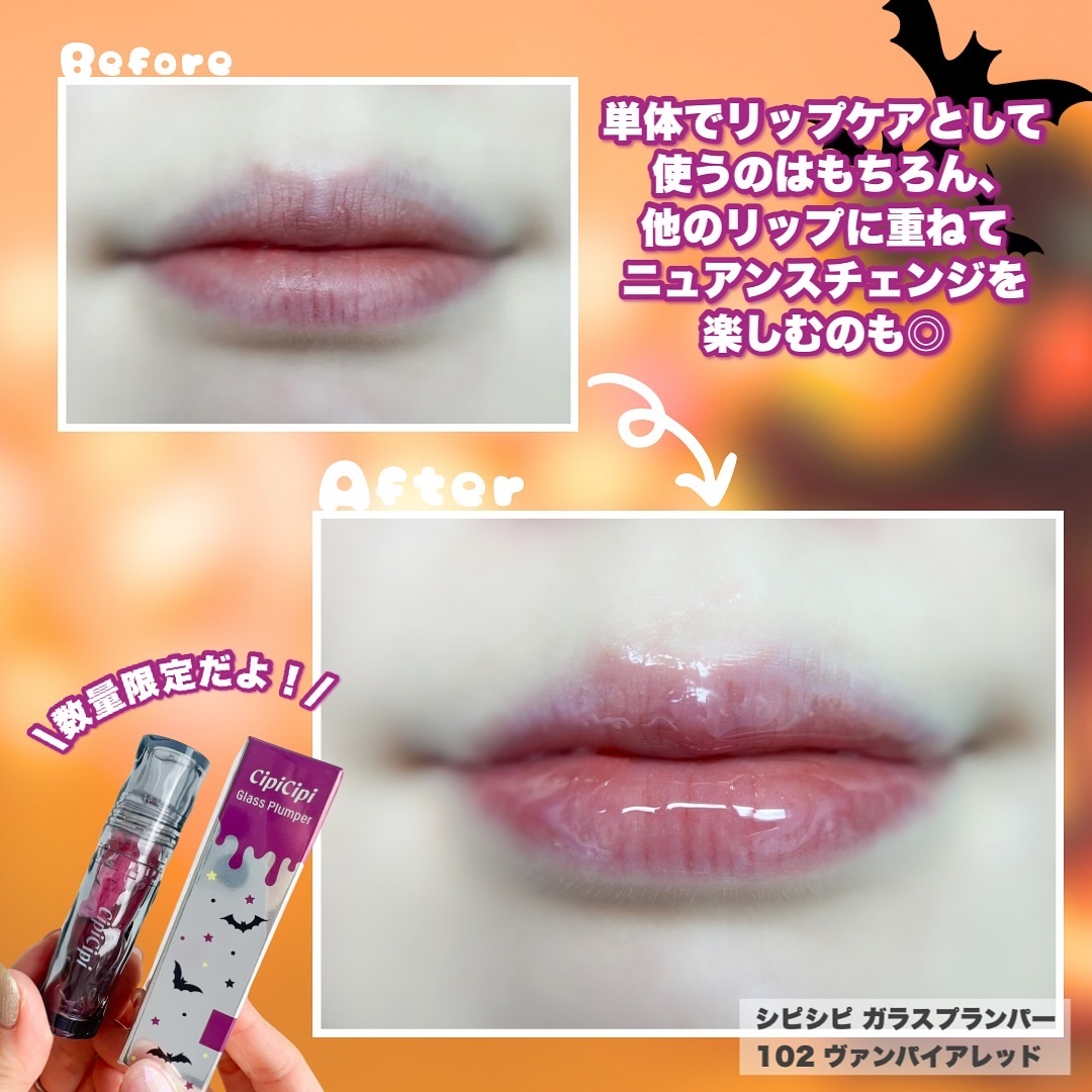 CipiCipiの大人気ガラスプランパーにハロウィン限定カラーが登場🎃 ほんのり色づくやや深みのある青みレッドレッド。 膜を張ったようなぽってりと厚みのある艶感で手持ちに重ねても単体でも◎ 程良いスースー感で比較的誰でも使いやすいプランパー🦇♡