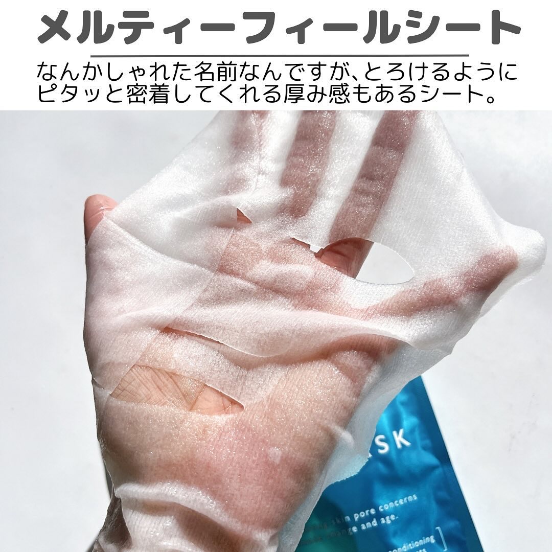 以前限定発売されて話題になったパックがパワーアップして定番化✨️ 限定発売時は○アゼライン酸誘導体* ○ナイアシンアミド**で皮脂対策に特化していたそうですが、 シートはメルティーフィールシートというとろけそうなくらい柔らかいシート✨️ 厚みがあるのにガサガサしにくいお気に入りシートです♡ みずみずしい軽い仕上がりで、毎日化粧水感覚で使えるというキャッチコピーにぴったりな使用感だと思いました👏