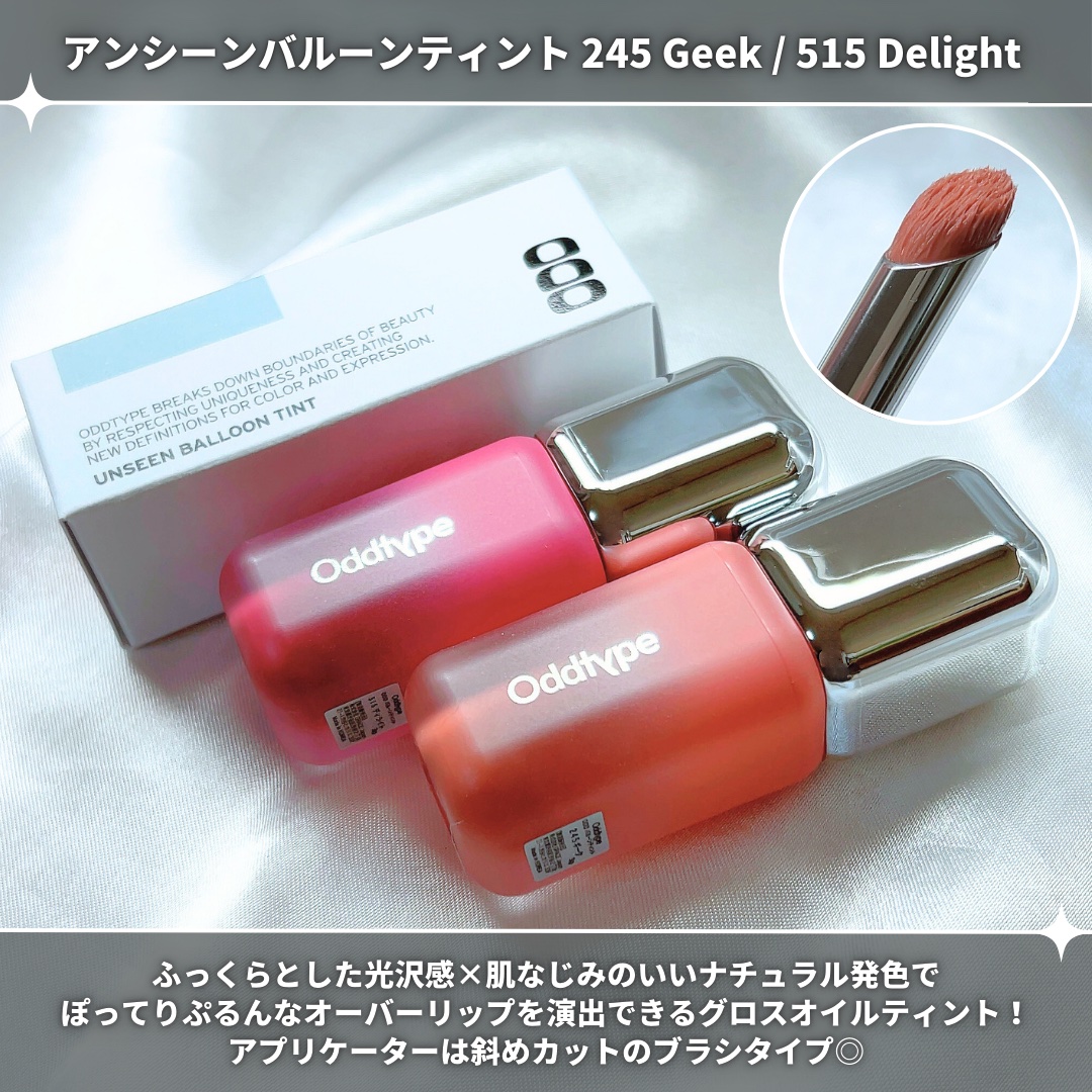 韓国の人気ファッションブランド「MUSINSA(ムシンサ)」から、ビューティーブランド「oddtype(オッドタイプ)」が誕生🇰🇷❤️ 2024年10月に日本上陸したのでご紹介✨ はっきりとした発色ならこれ✌️💫 ツヤ発色で、しっとりした塗り心地! アプリケーターが縦型ブラシになってる! わたしの推しはこちら💗 透け感があって、ちゅるんとした光沢がでてくれる!アプリケーター斜めカットのブラシで塗れるようになってるの🫧