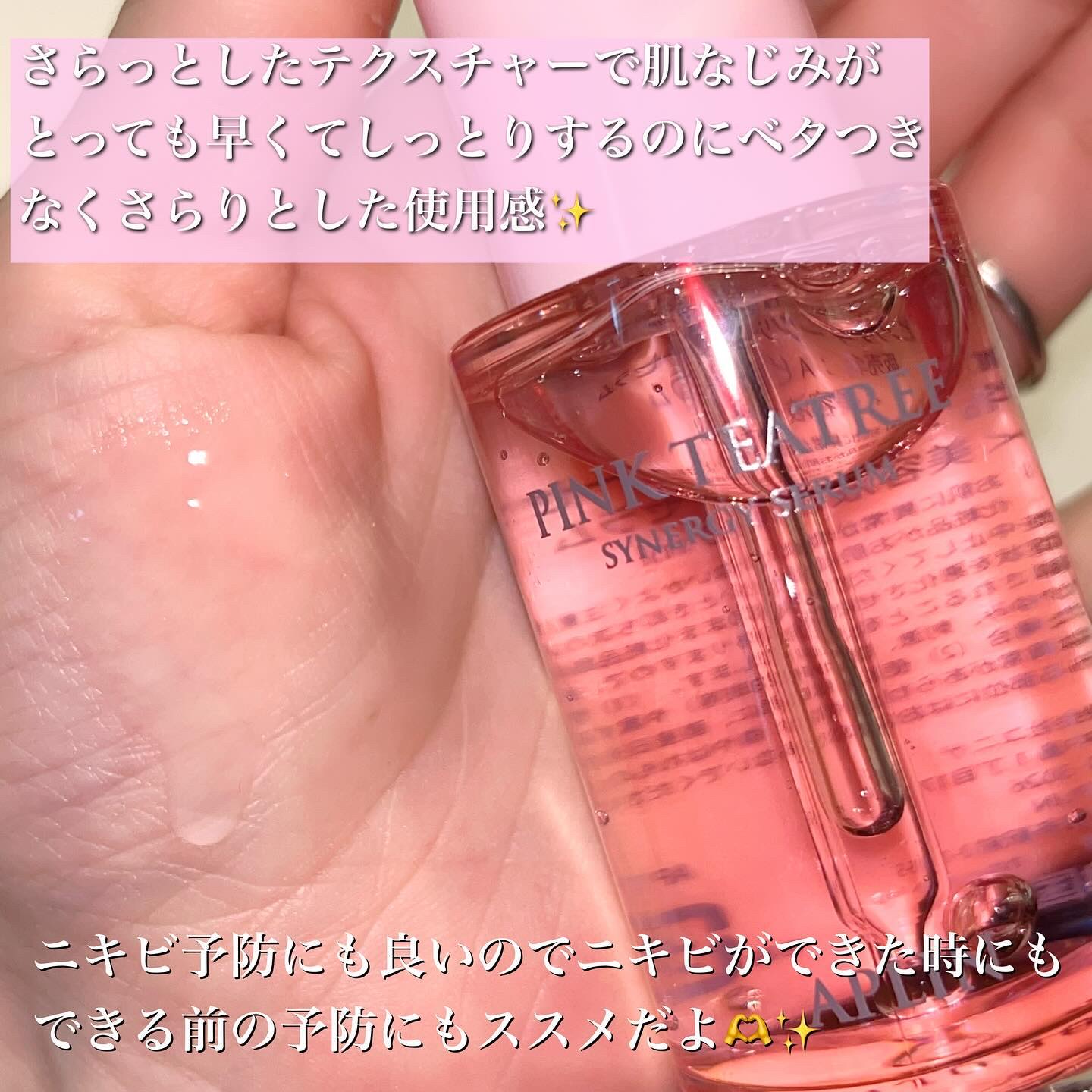 ピンクかわいいーーー! ってなるこのセラム🫶🏻 かわいいだけじゃ無いんです! 保湿成分のティーツリーやツボクサエキスなどのCICA成分や他にも優しいGREEN成分がたくさん! ほどよくとろみがあって、保湿感もあるんだけど重くない。
