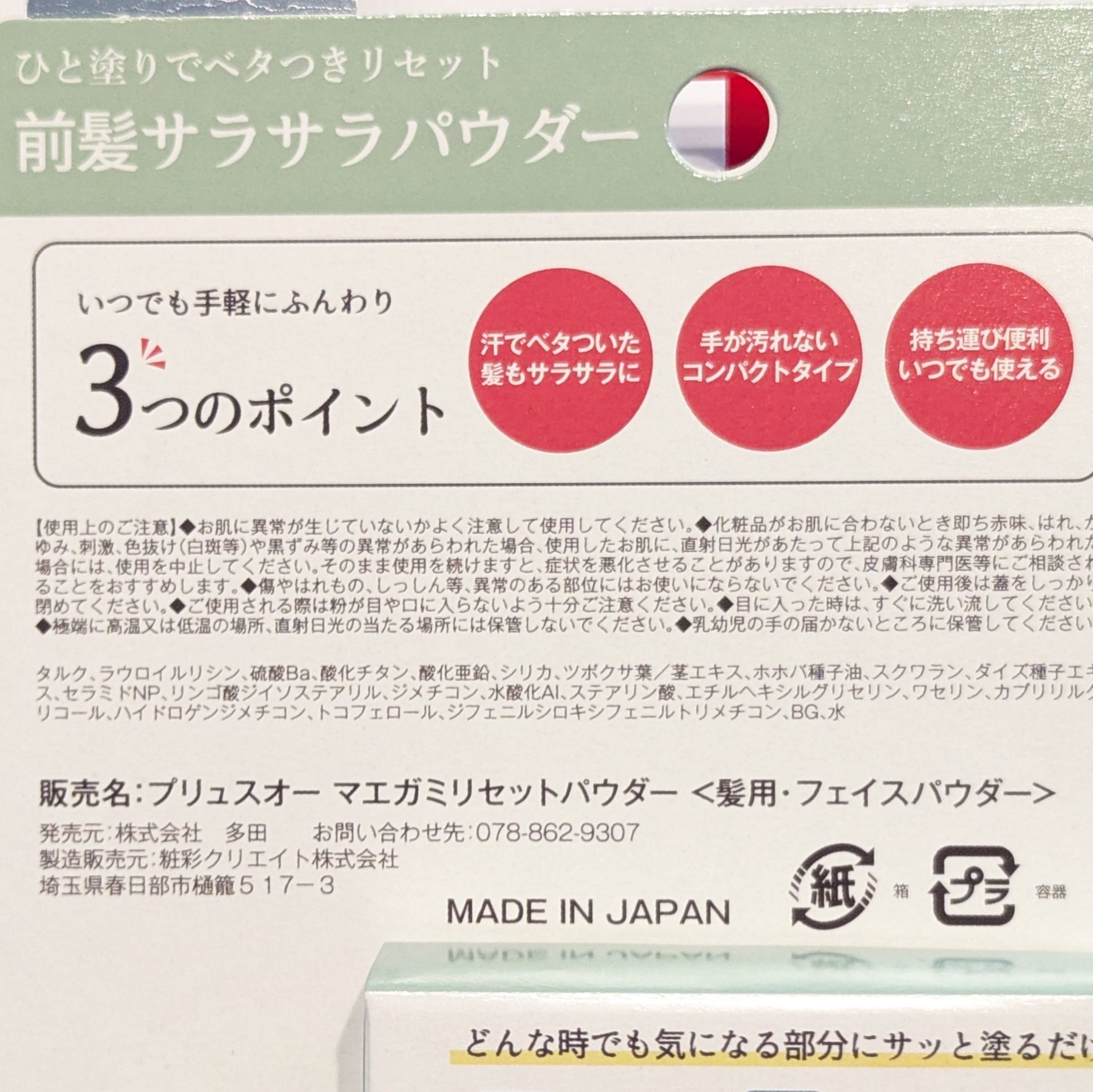 - 前髪のべたつき・テカリ・乱れに。 前髪のスタイリングキープに、朝おでこにぬって皮脂崩れ防止。 日中のベタつきや汗で乱れた前髪を、ふんわり前髪へお直し。 持ち運びに便利な鏡付き。 <レフィル> 待望の交換用レフィル。使い終わったマエガミリセットパウダー本体にセットしてお使いください。