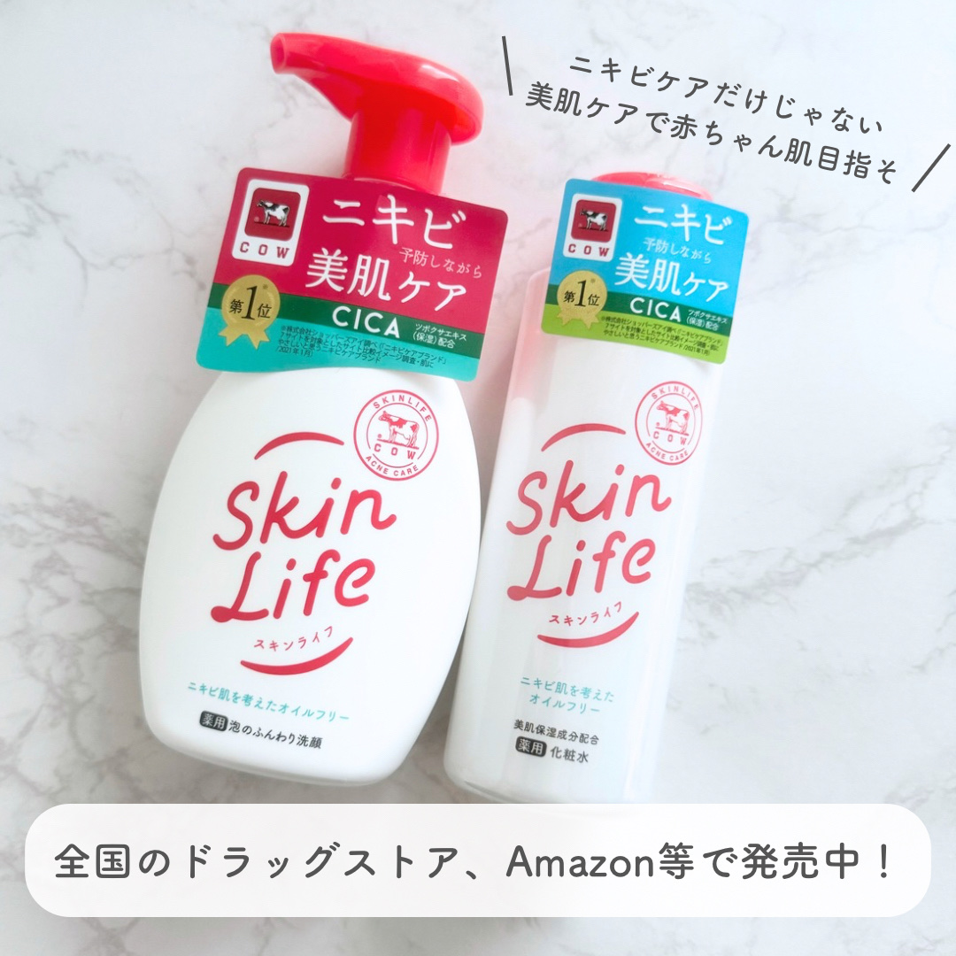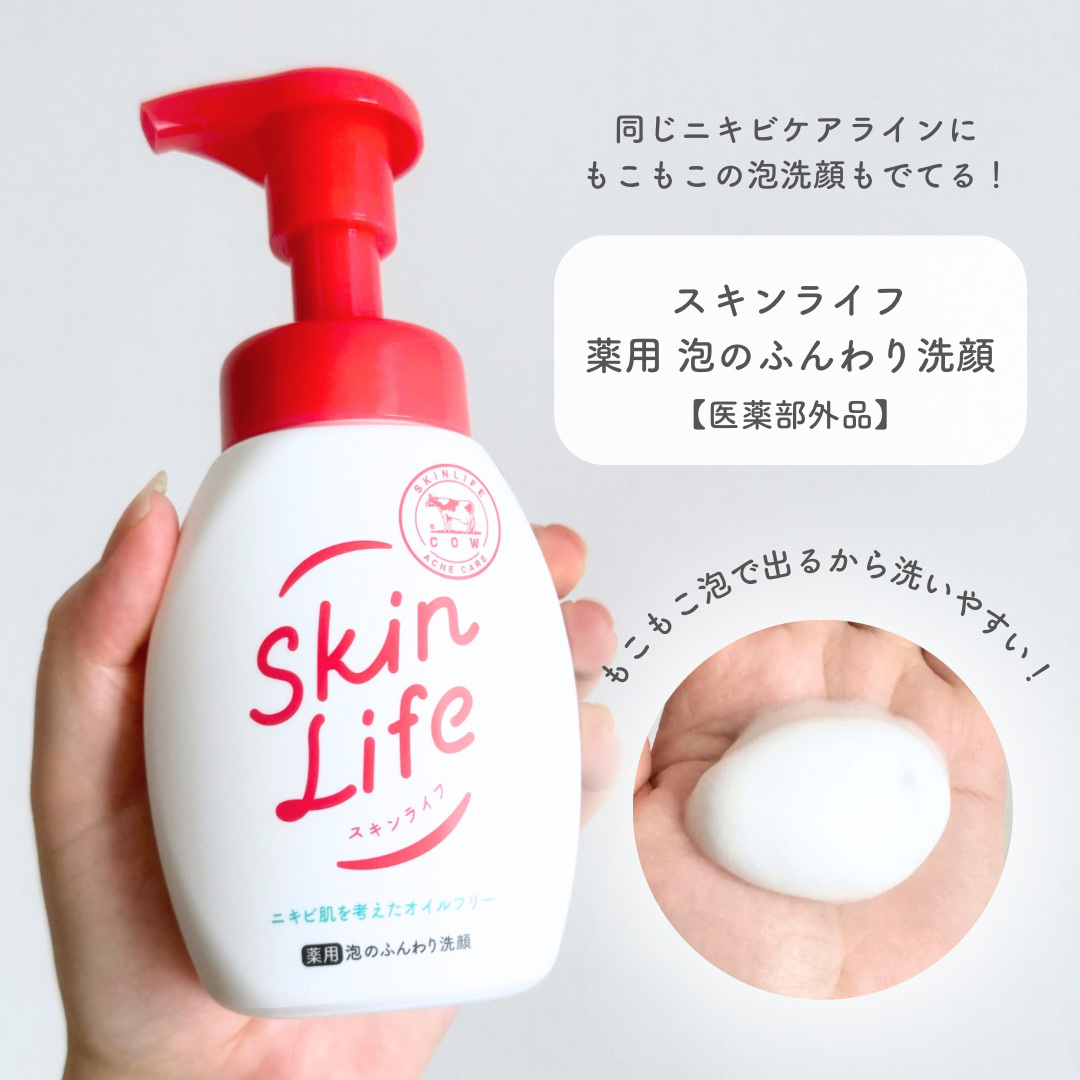 無香料でオイルフリー、ニキビ肌を考えた処方 CICA(ツボクサエキス)・ビタミンC誘導体・ヒアルロン酸配合で、ニキビケアしながら美肌ケアもできちゃう! ふわふわモチモチ泡の洗顔料は「グリセリンフリー」アイテムとしてSNSで話題! 医薬部外品のスキンライフシリーズは、全国のドラッグストアやAmazonなどのECサイトでも購入可能!