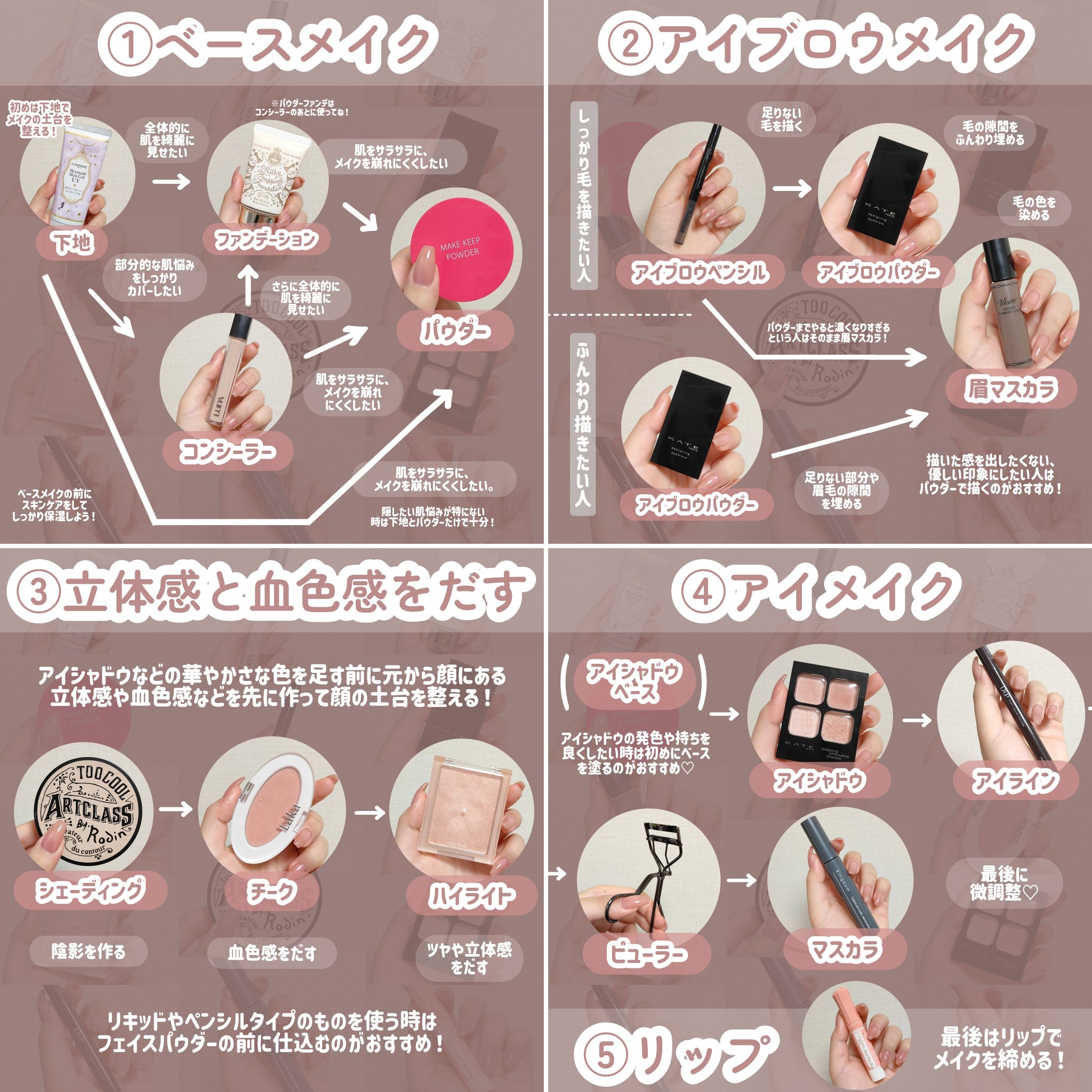可愛くメイクしてもクマがあると顔色が悪く疲れて見えて台無しに、、、 クマは大きく分けて3タイプ/青クマ/茶クマ/黒クマ の3種類がある♪ それぞれ補色を駆使して目立たなくするのがクマ隠しの大事なポイント✍️ 睡眠不足や疲れなどによる血行不良が原因💦 紫外線や摩擦などによる色素沈着が原因💦 目の下の脂肪の膨らみやたるみが原因💦 実は1番隠すのが難しいのが黒クマ🧸 間違った方法でカバーすると逆に目立ってしまうので自分のタイプを知った上で正しくカバーするのが大切✨