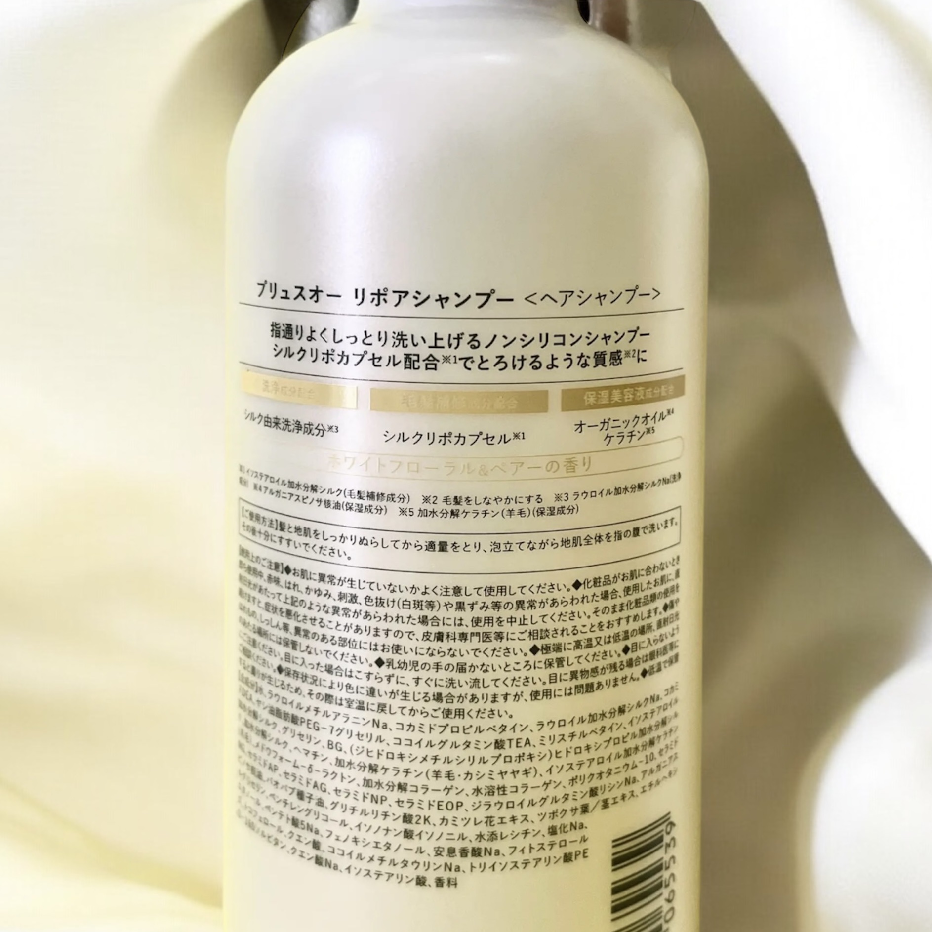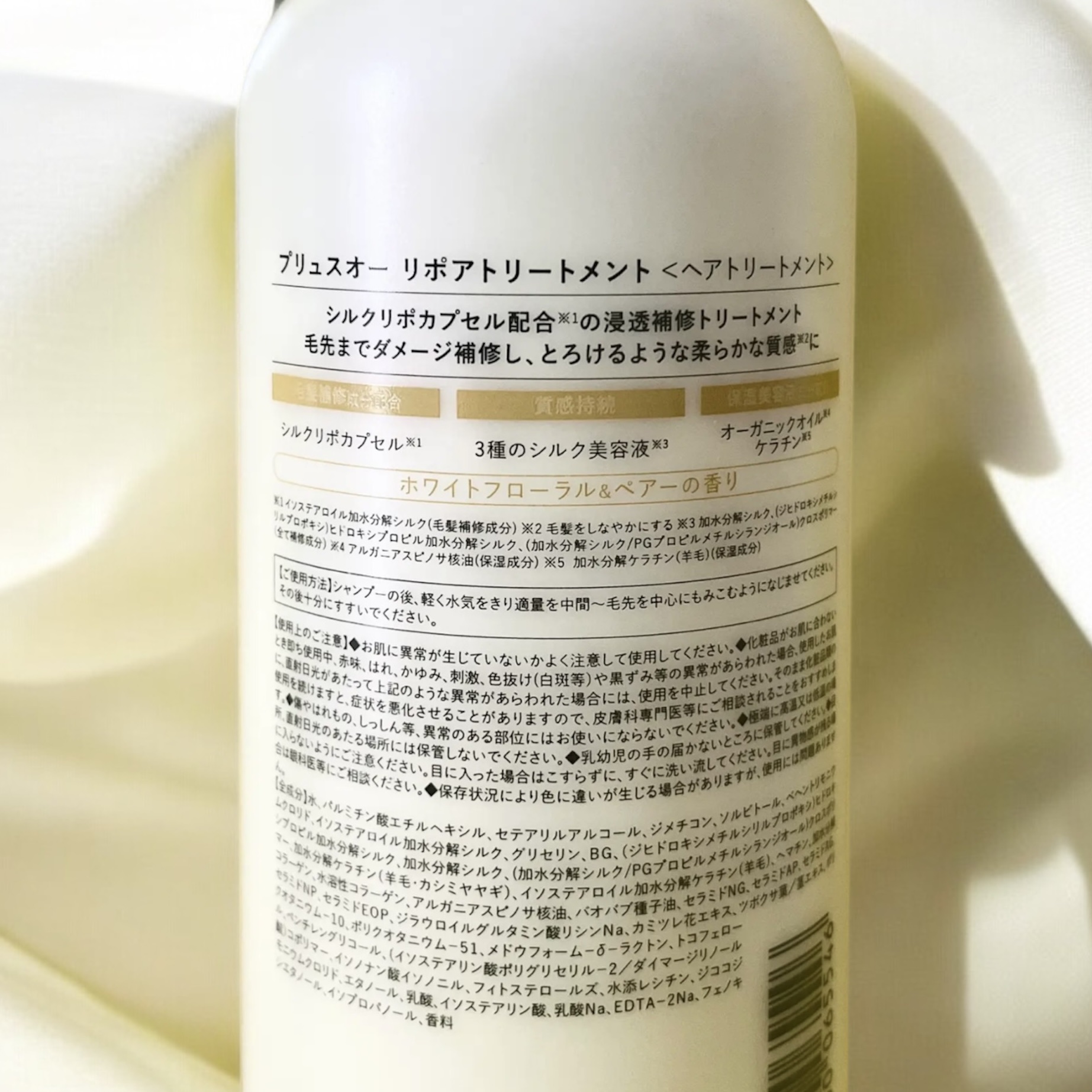 - とろけるような質感と、ダメージでパサつきがちな髪も毛先までツヤめくしっとり髪へ導く美容液シャンプー&光沢補修トリートメント。 より浸透性が高くなるカプセル化技術を採用したシルクリポカプセルを補修成分として配合。 髪の芯まで徹底補修しながらキューティクルをなめらかに整え、しっとりと潤いツヤめく髪へと導きます。 また洗いながらも髪ダメージを補修するPPT系洗浄成分を、シリーズ比で高濃度に配合。 シルク由来PPT系洗浄成分と、肌のことを考えたアミノ酸系の4種の洗浄成分とバランスよくブレンドすることでキメ細かな濃密補修泡が摩擦レスでリッチな洗い心地を実現し、髪と頭皮をいたわりながらシャンプーでも毛髪ダメージに徹底アプローチします。 カシミヤ由来のケラチンをはじめとする2種のケラチン、コラーゲン、CMC類似成分などのこだわり配合した補修成分だけでなく、美容保湿成分をたっぷり浸透させて密封補修することで、カラーや熱ダメージによるパサつき・広がり・ゴワつきなどの蓄積ダメージもしっかりケア。 ドライヤーやヘアアイロンの熱ダメージから髪を守りツヤを与える、ヒートリペア成分を配合して熱も味方に。 清楚な上品さを纏うホワイトフローラル&ペア―の香り。 2024年10月中旬 一部企業にて先行発売