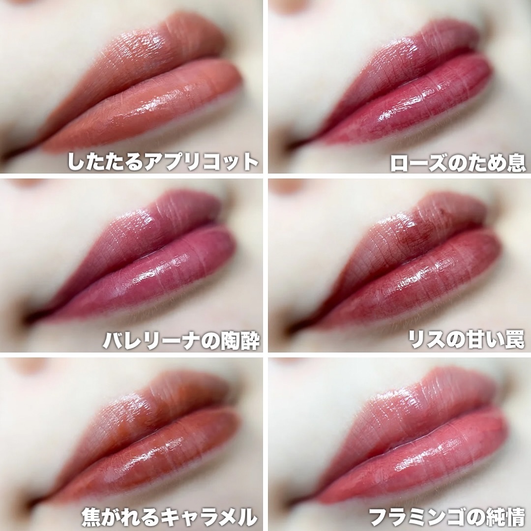 - <BE330 したたるアプリコット> 水、水添ポリイソブテン、BG、ダイマージリノレイル水添ロジン縮合物、リンゴ酸ジイソステアリル、ワセリン、ミネラルオイル、トリイソステアリン酸ポリグリセリル-2、TEA、エタノール、シロキクラゲエキス、ステビア葉/茎エキス、トコフェロール、ヒアルロン酸Na、PEG-10水添ヒマシ油、(アクリル酸Na/アクリロイルジメチルタウリンNa)コポリマー、(アクリレーツ/アクリル酸アルキル(C10-30))クロスポリマー、イソヘキサデカン、オレイン酸ソルビタン、カルボマー、スクワラン、ステアリン酸、ステアリン酸グリセリル、セテアリルアルコール、トリエチルヘキサノイン、ヒドロキシプロピルメチルセルロース、ベヘニルアルコール、ポリアクリル酸アンモニウム、ポリソルベート80、水酸化Al、フェノキシエタノール、酸化チタン、黄4、青1、赤227、橙205 <BE332 みつばちのワルツ> 水、水添ポリイソブテン、BG、ダイマージリノレイル水添ロジン縮合物、リンゴ酸ジイソステアリル、ワセリン、ミネラルオイル、トリイソステアリン酸ポリグリセリル-2、TEA、エタノール、ステビア葉/茎エキス、トコフェロール、ヒアルロン酸Na、PEG-10水添ヒマシ油、(アクリル酸Na/アクリロイルジメチルタウリンNa)コポリマー、(アクリレーツ/アクリル酸アルキル(C10-30))クロスポリマー、イソヘキサデカン、オレイン酸ソルビタン、カルボマー、シロキクラゲ多糖体、スクワラン、ステアリン酸、ステアリン酸グリセリル、セテアリルアルコール、トリエチルヘキサノイン、ヒドロキシプロピルメチルセルロース、ベヘニルアルコール、ポリアクリル酸アンモニウム、ポリソルベート80、水酸化Al、フェノキシエタノール、酸化チタン、黄4、青1、赤227、橙205 <BR331 リスの甘い罠> 水、水添ポリイソブテン、BG、ダイマージリノレイル水添ロジン縮合物、リンゴ酸ジイソステアリル、ワセリン、ミネラルオイル、トリイソステアリン酸ポリグリセリル-2、TEA、エタノール、シロキクラゲエキス、ステビア葉/茎エキス、トコフェロール、ヒアルロン酸Na、PEG-10水添ヒマシ油、(アクリル酸Na/アクリロイルジメチルタウリンNa)コポリマー、(アクリレーツ/アクリル酸アルキル(C10-30))クロスポリマー、イソヘキサデカン、オレイン酸ソルビタン、カルボマー、スクワラン、ステアリン酸、ステアリン酸グリセリル、セテアリルアルコール、トリエチルヘキサノイン、ヒドロキシプロピルメチルセルロース、ベヘニルアルコール、ポリソルベート80、フェノキシエタノール、黄4、青1、赤227、橙205 <OR230 焦がれるキャラメル> 水、水添ポリイソブテン、BG、ダイマージリノレイル水添ロジン縮合物、リンゴ酸ジイソステアリル、ワセリン、ミネラルオイル、トリイソステアリン酸ポリグリセリル-2、TEA、エタノール、シロキクラゲエキス、ステビア葉/茎エキス、トコフェロール、ヒアルロン酸Na、PEG-10水添ヒマシ油、(アクリル酸Na/アクリロイルジメチルタウリンNa)コポリマー、(アクリレーツ/アクリル酸アルキル(C10-30))クロスポリマー、イソヘキサデカン、オレイン酸ソルビタン、カルボマー、スクワラン、ステアリン酸、ステアリン酸グリセリル、セテアリルアルコール、トリエチルヘキサノイン、ヒドロキシプロピルメチルセルロース、ベヘニルアルコール、ポリアクリル酸アンモニウム、ポリソルベート80、水酸化Al、フェノキシエタノール、酸化チタン、黄4、青1、赤227、橙205 <PK830 フラミンゴの純情> 水、水添ポリイソブテン、BG、ダイマージリノレイル水添ロジン縮合物、リンゴ酸ジイソステアリル、ワセリン、ミネラルオイル、トリイソステアリン酸ポリグリセリル-2、TEA、エタノール、シロキクラゲエキス、ステビア葉/茎エキス、トコフェロール、ヒアルロン酸Na、PEG-10水添ヒマシ油、(アクリル酸Na/アクリロイルジメチルタウリンNa)コポリマー、(アクリレーツ/アクリル酸アルキル(C10-30))クロスポリマー、イソヘキサデカン、オレイン酸ソルビタン、カルボマー、スクワラン、ステアリン酸、ステアリン酸グリセリル、セテアリルアルコール、トリエチルヘキサノイン、ヒドロキシプロピルメチルセルロース、ベヘニルアルコール、ポリアクリル酸アンモニウム、ポリソルベート80、水酸化Al、フェノキシエタノール、酸化チタン、黄4、青1、赤227、橙205 <PK831 バレリーナの陶酔> 水、水添ポリイソブテン、BG、ダイマージリノレイル水添ロジン縮合物、リンゴ酸ジイソステアリル、ワセリン、ミネラルオイル、トリイソステアリン酸ポリグリセリル-2、TEA、エタノール、シロキクラゲエキス、ステビア葉/茎エキス、トコフェロール、ヒアルロン酸Na、PEG-10水添ヒマシ油、(アクリル酸Na/アクリロイルジメチルタウリンNa)コポリマー、(アクリレーツ/アクリル酸アルキル(C10-30))クロスポリマー、イソヘキサデカン、オレイン酸ソルビタン、カルボマー、スクワラン、ステアリン酸、ステアリン酸グリセリル、セテアリルアルコール、トリエチルヘキ
